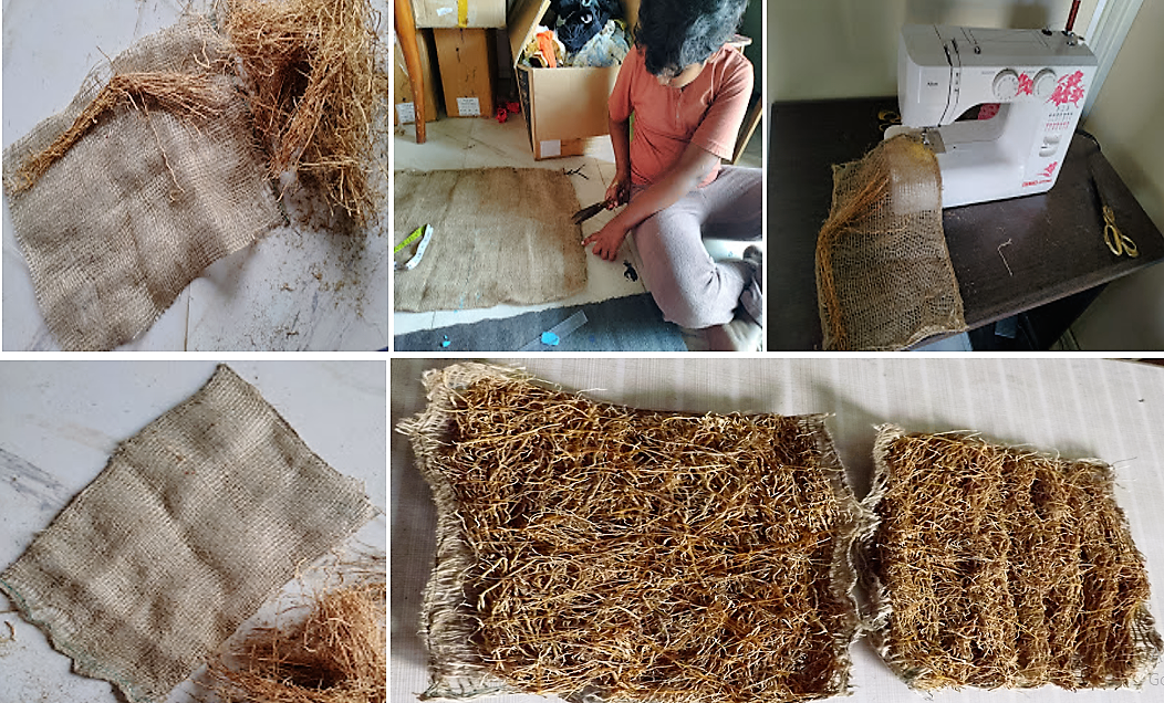I wanted to make with a natural Eco friendly material. Hence I chose Khus Khus/Vettiver, which emanates a pleasant smell and retains a good amount of water. I bought these items from Pune, when I went for the regional evaluation to the DIY Lab to Supriya Kadam. I took a thin gunny bag as a base to sew the Khus Khus onto it. I cut the gunny bag and hemmed the borders on a sewing machine.
