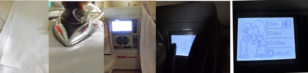 First I took a white cotton cloth and placed bakram beneath it. Ironed it hard, so that it gets stuck to the cloth and fixed it on the frame. Then I set the setting on the Janome digital embroidery machine.