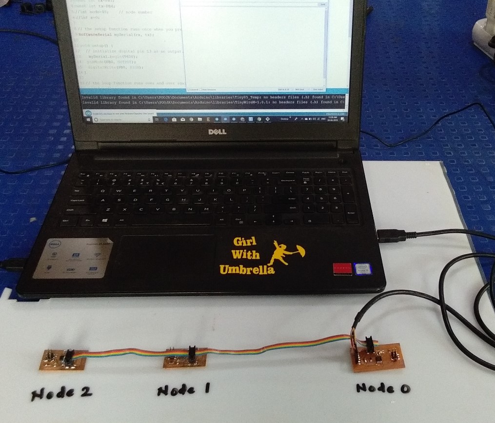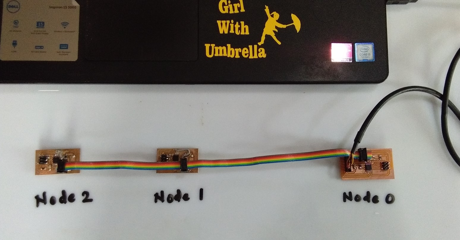 Then I arranged three board in serialy.I used 3x3 Pin header with Ribben cable to make a communication Bus.I connected RX and TX from each board using ribben cable. Then I checked continuity.