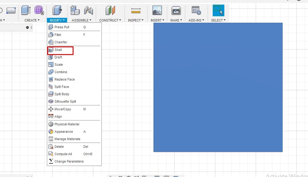E.switch to TOP View of Object and use SHELL command to make Hole in that Object.