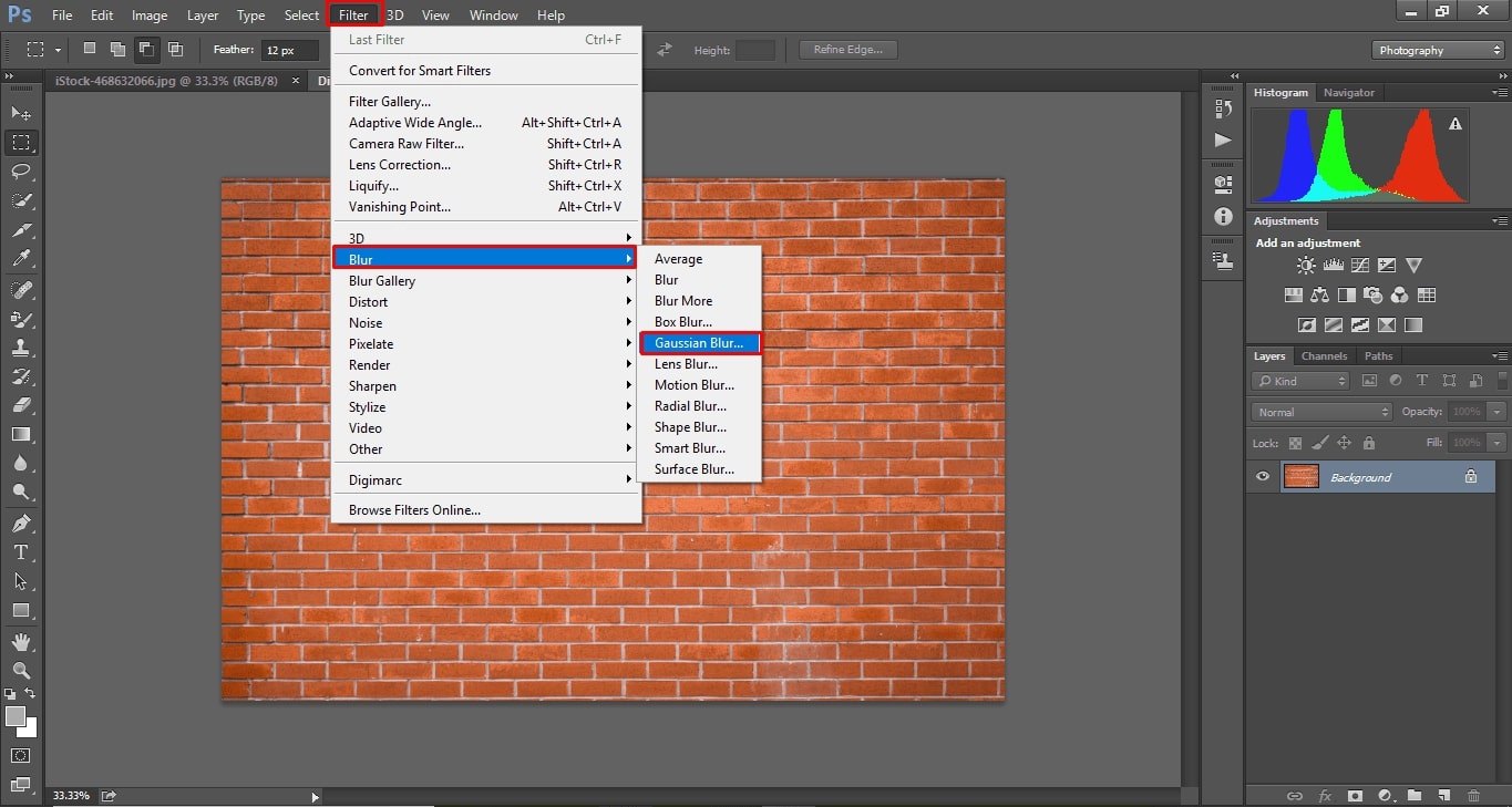 A.I download a brick photo and open with Photoshop. I duplicate the layer. Then In document select New option, give a name to a layer and press OK. Next In Filter select Blur and Apply Gaussian Blur on brick image, blur radius is set on 3.0. last click OK.