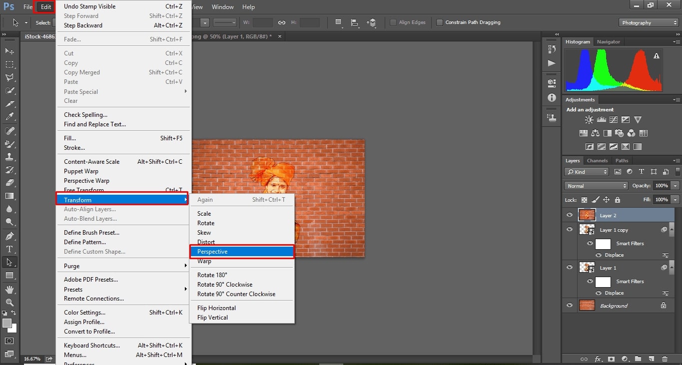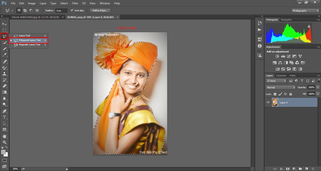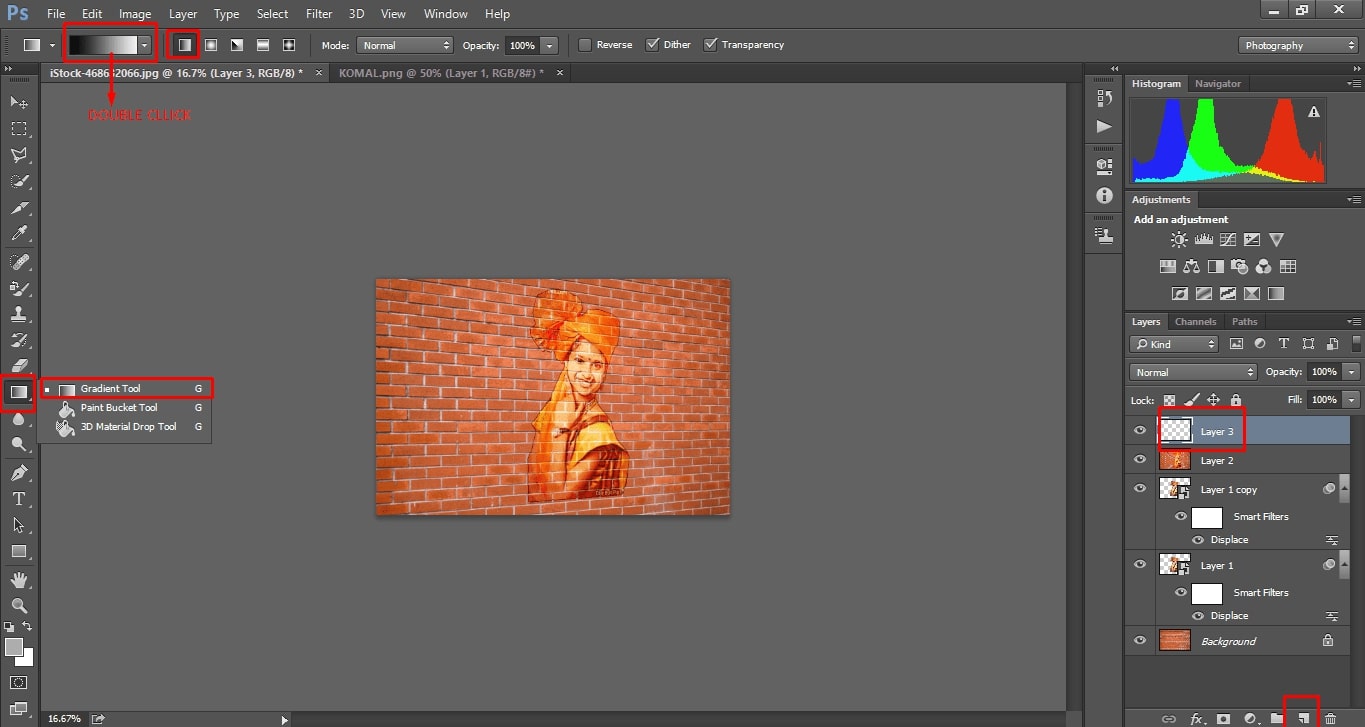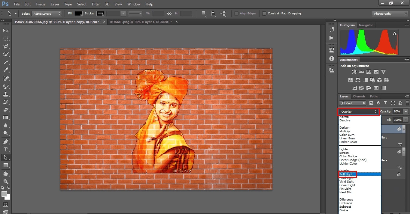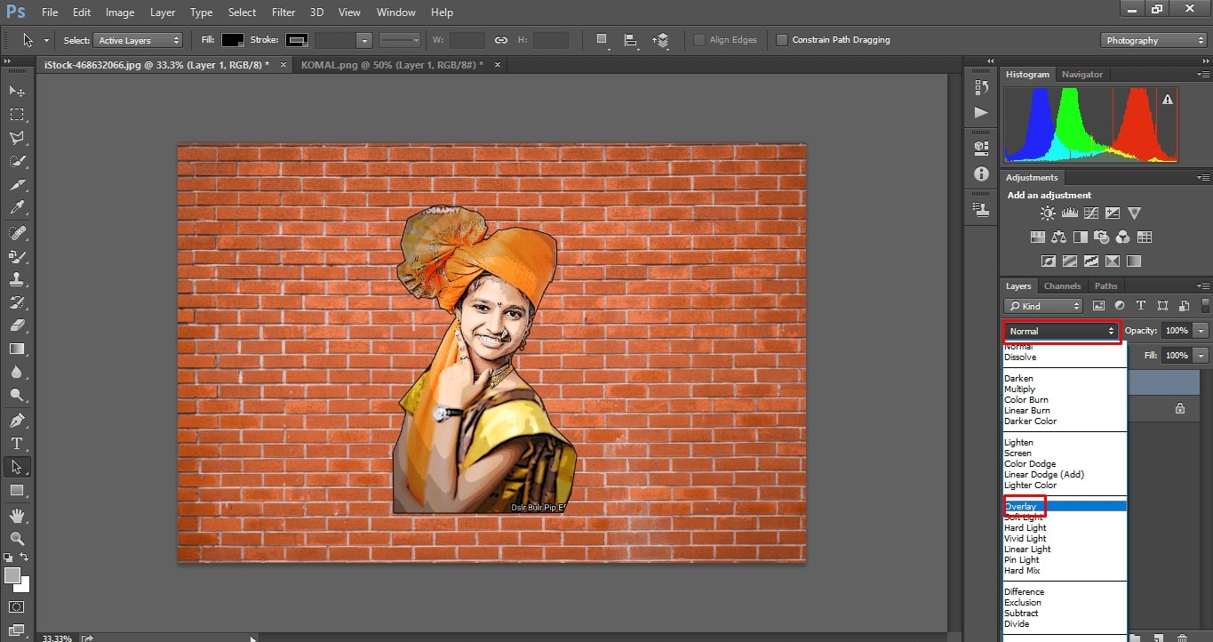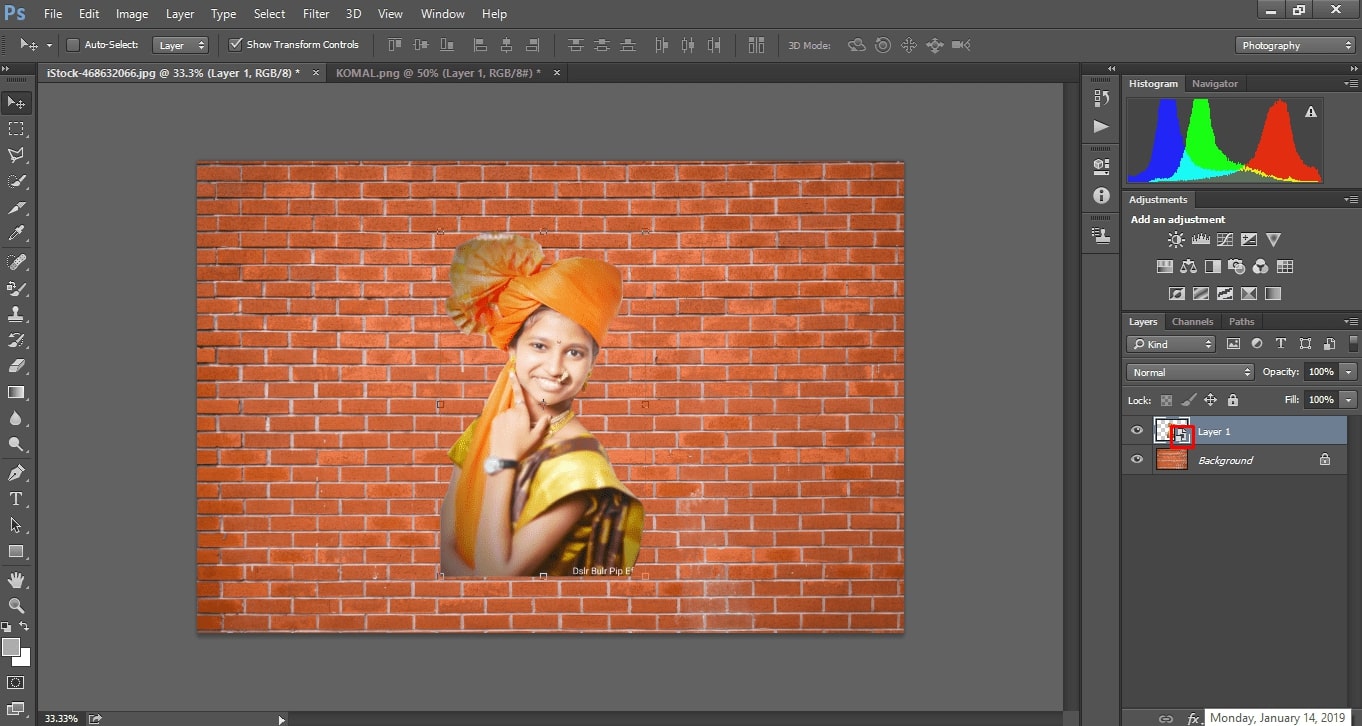 C.I took my colleague photo for further work with her permission. I use Polygonal Lasso tool to trim photo. To move on Layer1, I use shortcut key Ctrl+J. I Cut Selection area and Paste it on brick image.