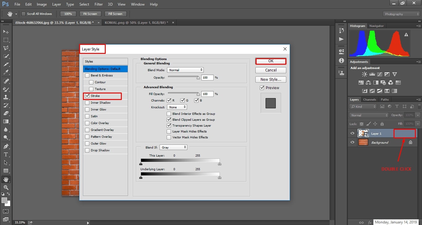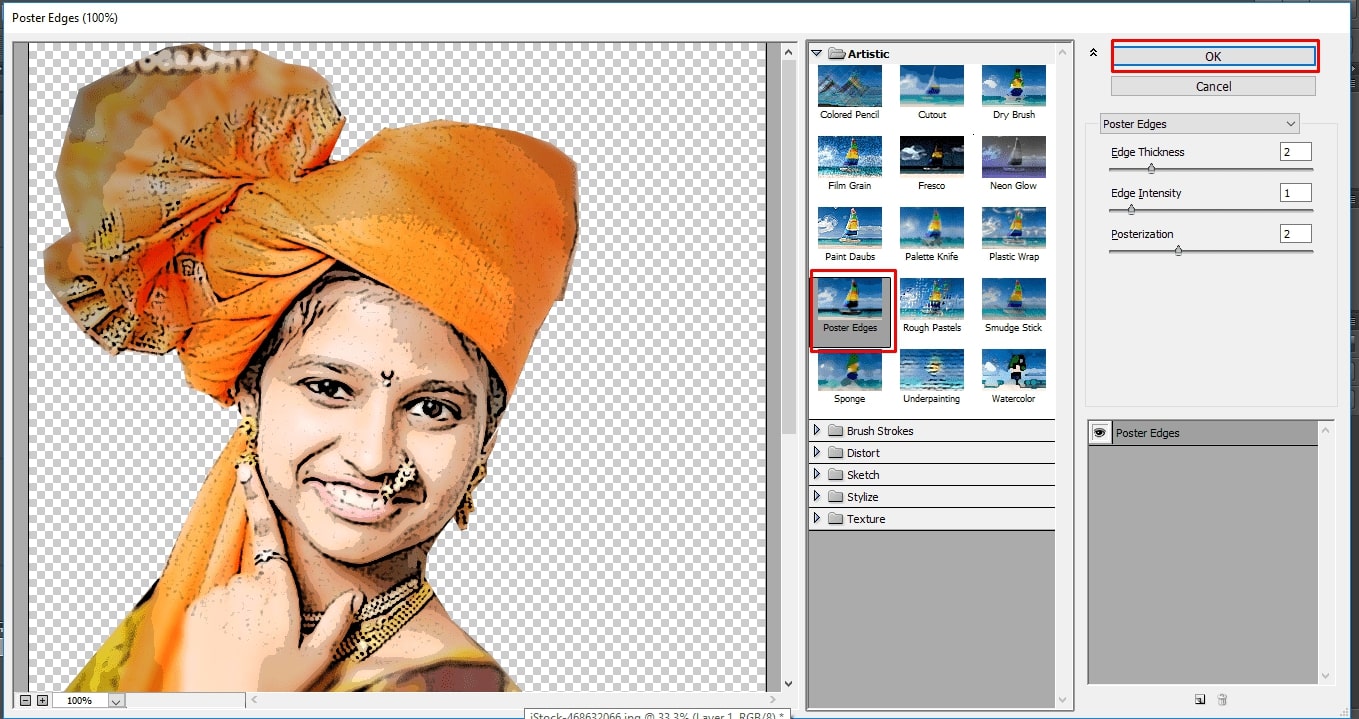 E. Now in Layer Setting, I Select Convert to Smart Object. Then Double clicks on layer to open layer style window, click on Stroke and OK it. I open Filter Gallery filter and selected one theme. For overlapping images on bricks I go to normal, which is in layer setting and change it in Overlay.
