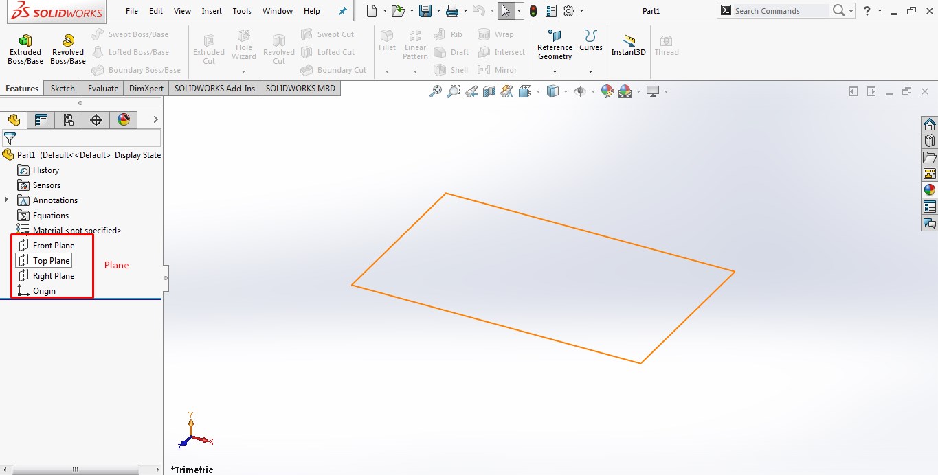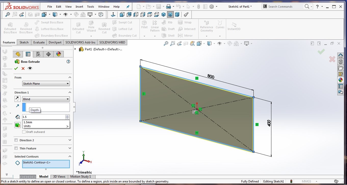 A.open Solidworks, click on file menu and create new part. Once home screen open select Front plane by pressing Spacebar Button. Go to Sketch tool, draw a rectangle on front Plane of dimension 800 X 400 mm. Then extrude it 1.5mm