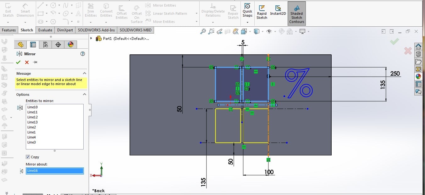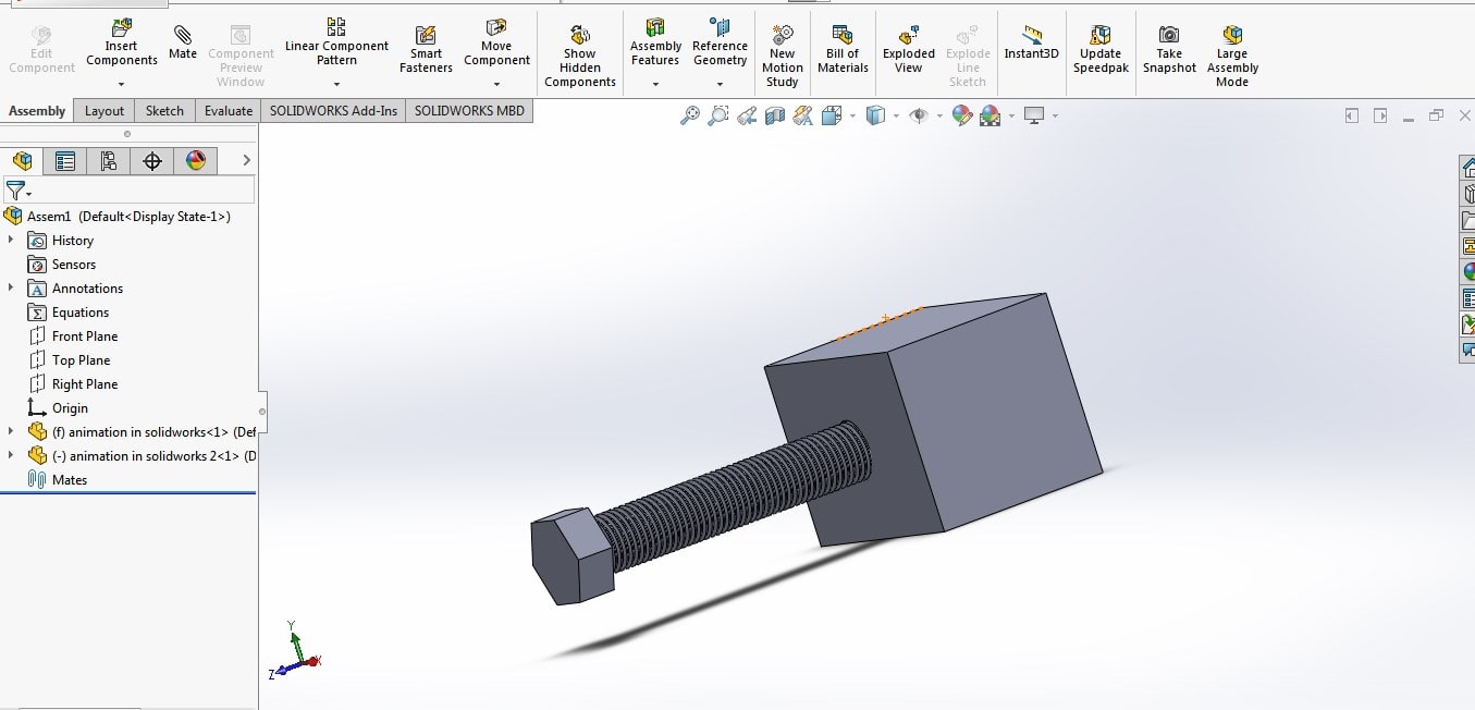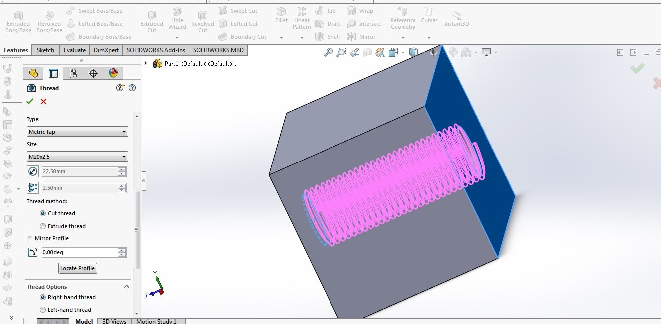 A.select front plan, Draw a rectangle of dimension 70 X 70 X 100mm. Now select side plane and draw a circle of radius 22mm. Next go to search bar and search for Thread command and select two edges of circle, click OK. It will look like fit for Skew.