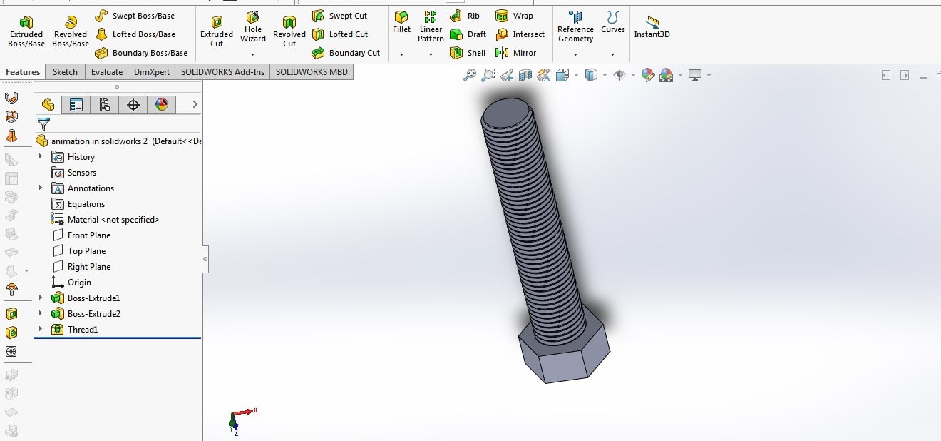 B.For second part create new part. Draw a Polygon. Extrude it 50mm. On Top, draw a circle, extrude it 70mm. Once again go to Thread option and make it like screw using it.