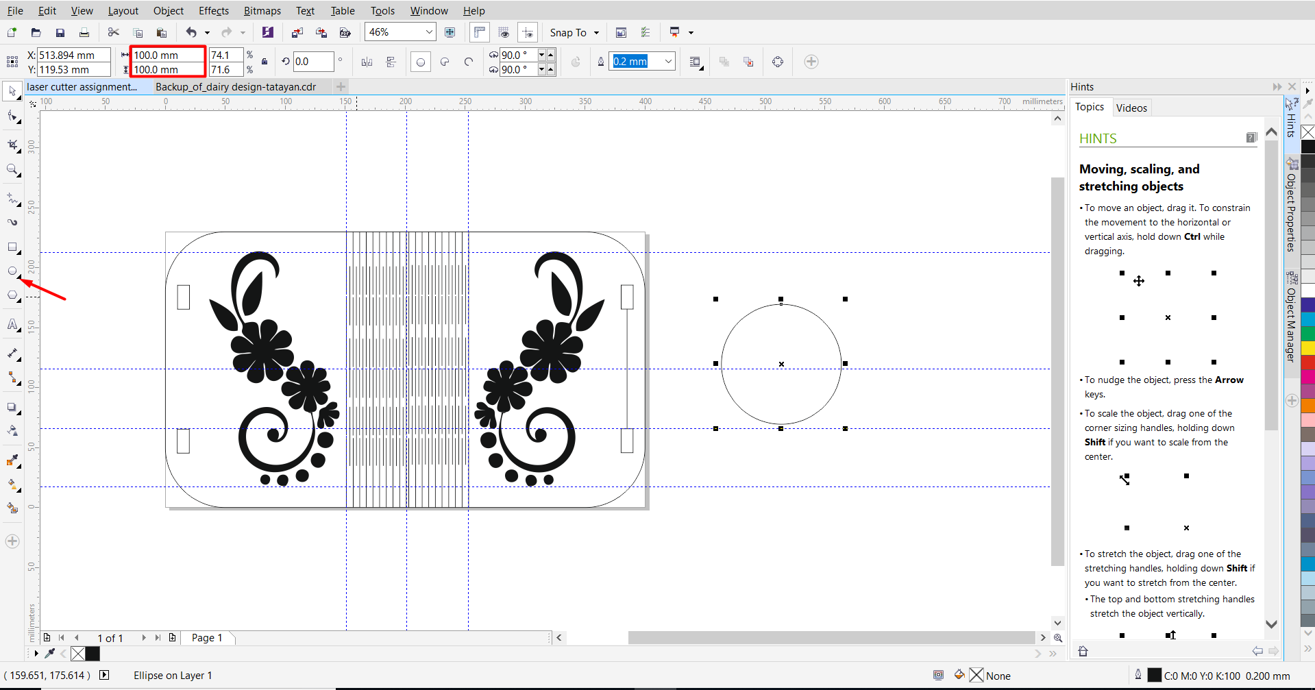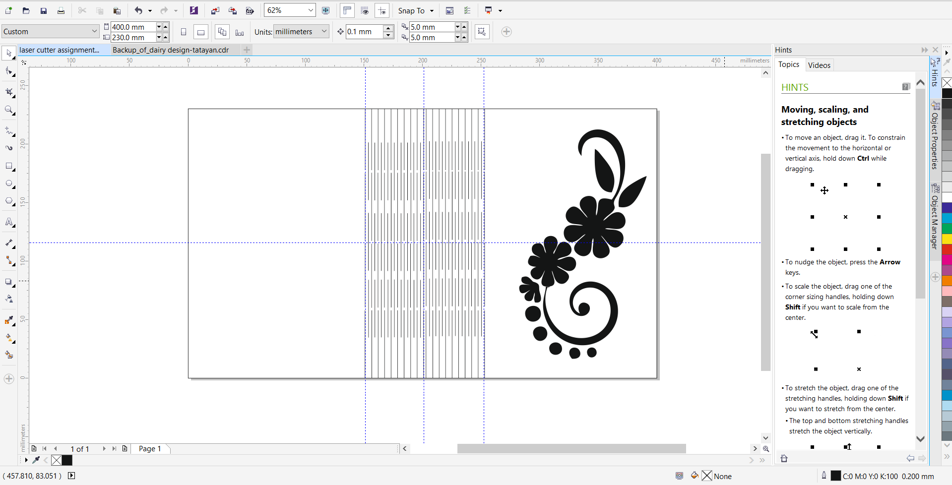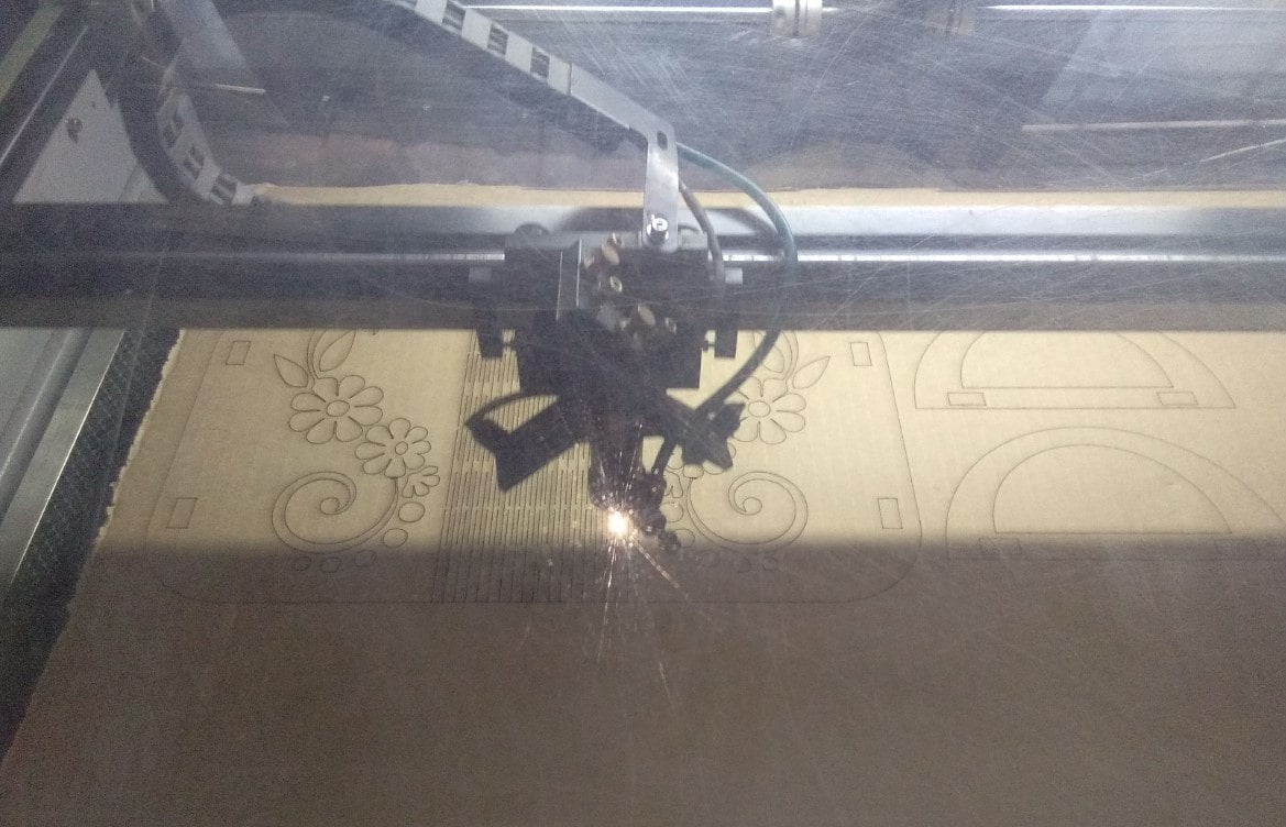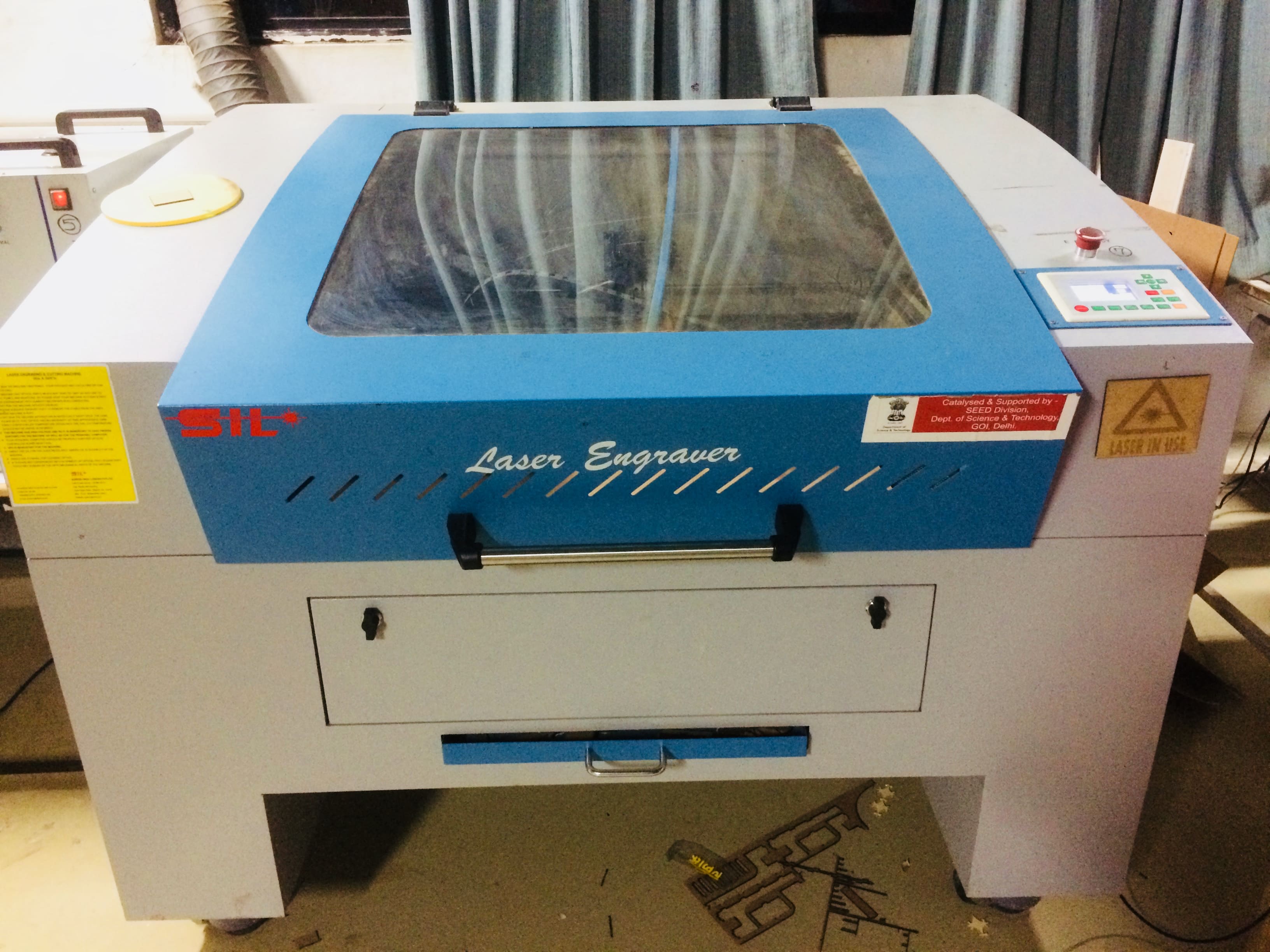 Here we have two types of laser cutter i.e SIL laser cutter and epilog laser cutter. Generally, we use SIL laser or CO2 laser cutter which have a 600*900mm bed area and can cut material up to 12mm. It has Own Software which is RD Work.It important only .dxf for cutting,engraving and Scanning speed and power modify according using a 2.06 mm Cardboard.