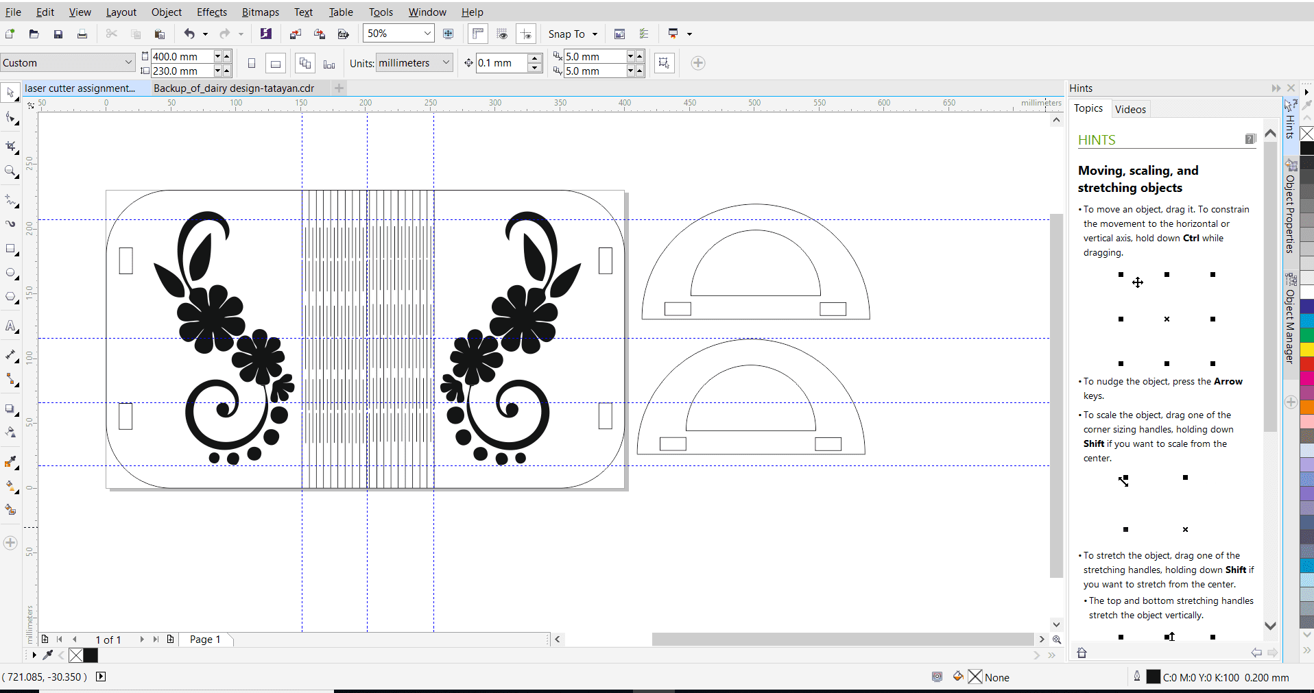 I design a 40 X 30mm rectangular shape.and sepearted cutting process and time at different speed and power.we found the best result in speed 40 and power72,the kerf form of 40mm width kerf was 0.4mm and 30mm height kerf was 0.29mm.