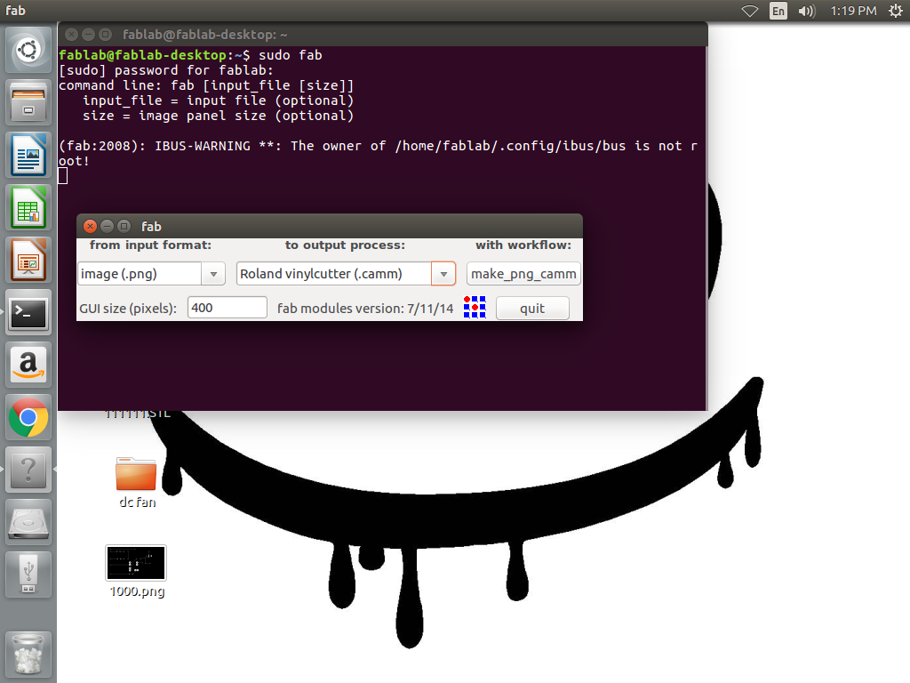A.We used the fab modules, to interface with the cutter. Fab modules can be downloaded free from the Fab website. To run the module, use the sudo Fab command. Then put the password and press enter.