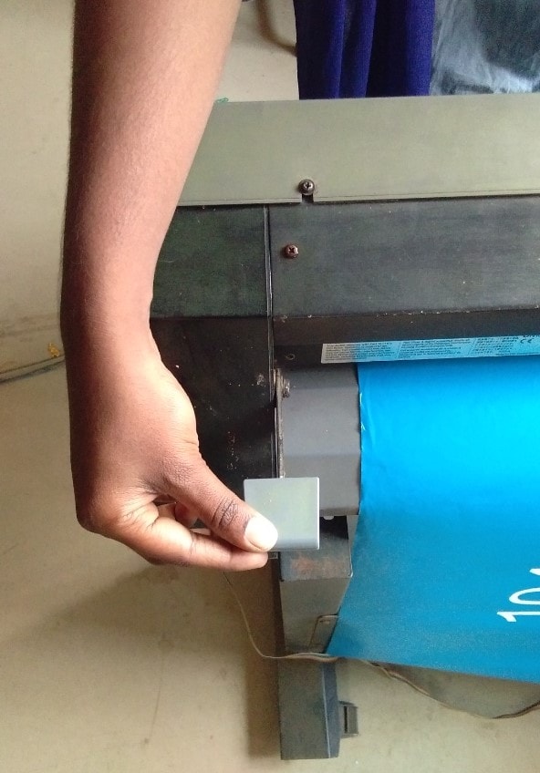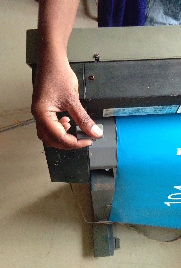 D.Before sending its design to a vinyl cutter. I select the roll of vinyl and place it on the rollers behind the machine. Place the lever in the down position and load the vinyl. Then I can see the rubber wheels and under the rubber wheels there is a white sticker indicator.