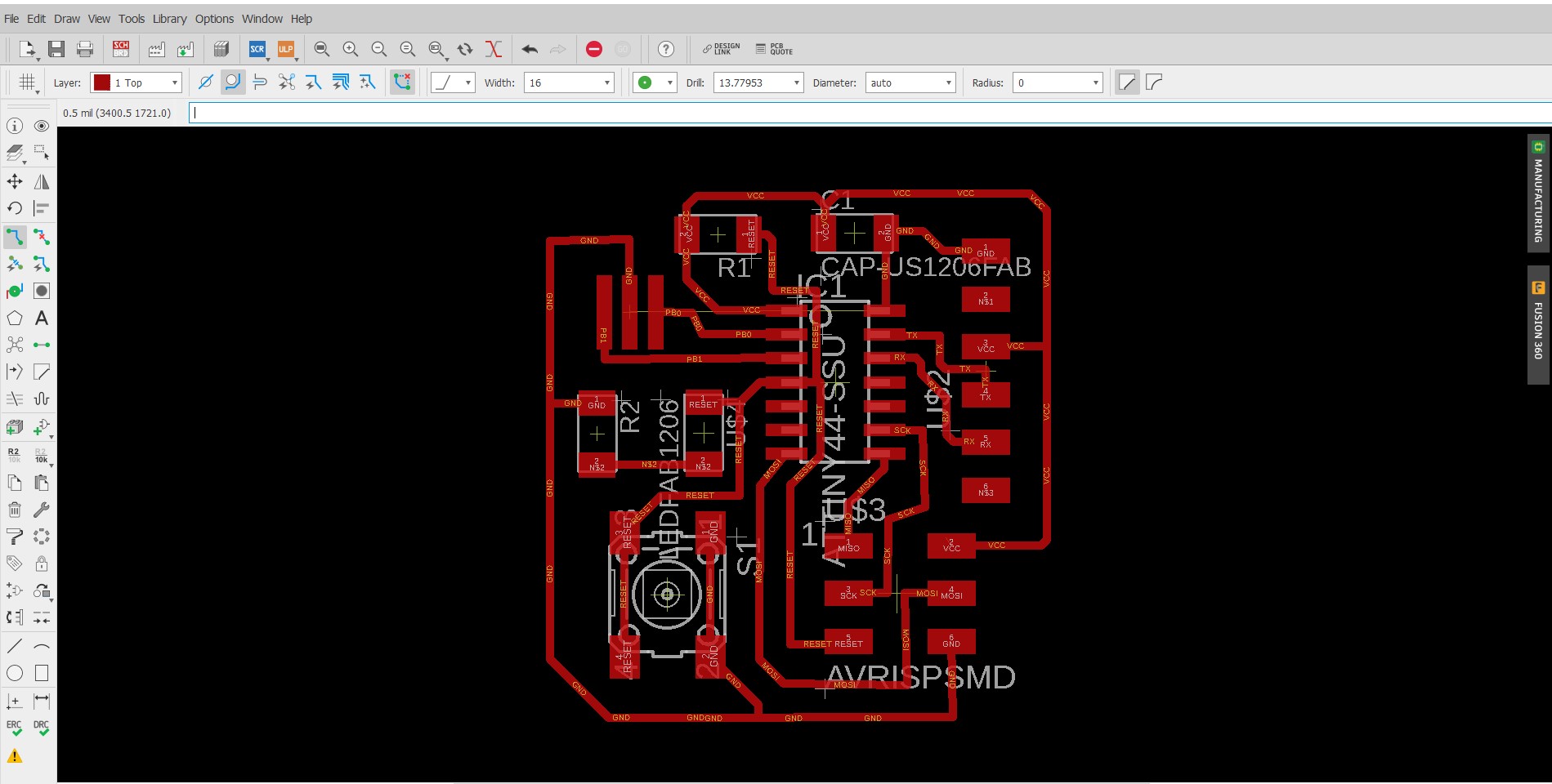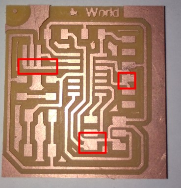 After milling I Checked out my first PCB. It had a track thickness of 0.508mm which was very hard, thus I decided to change the thickness of the tracks. There was no clearance in the paddings of the IC. This time I decreased the trace width to 0.2mm.