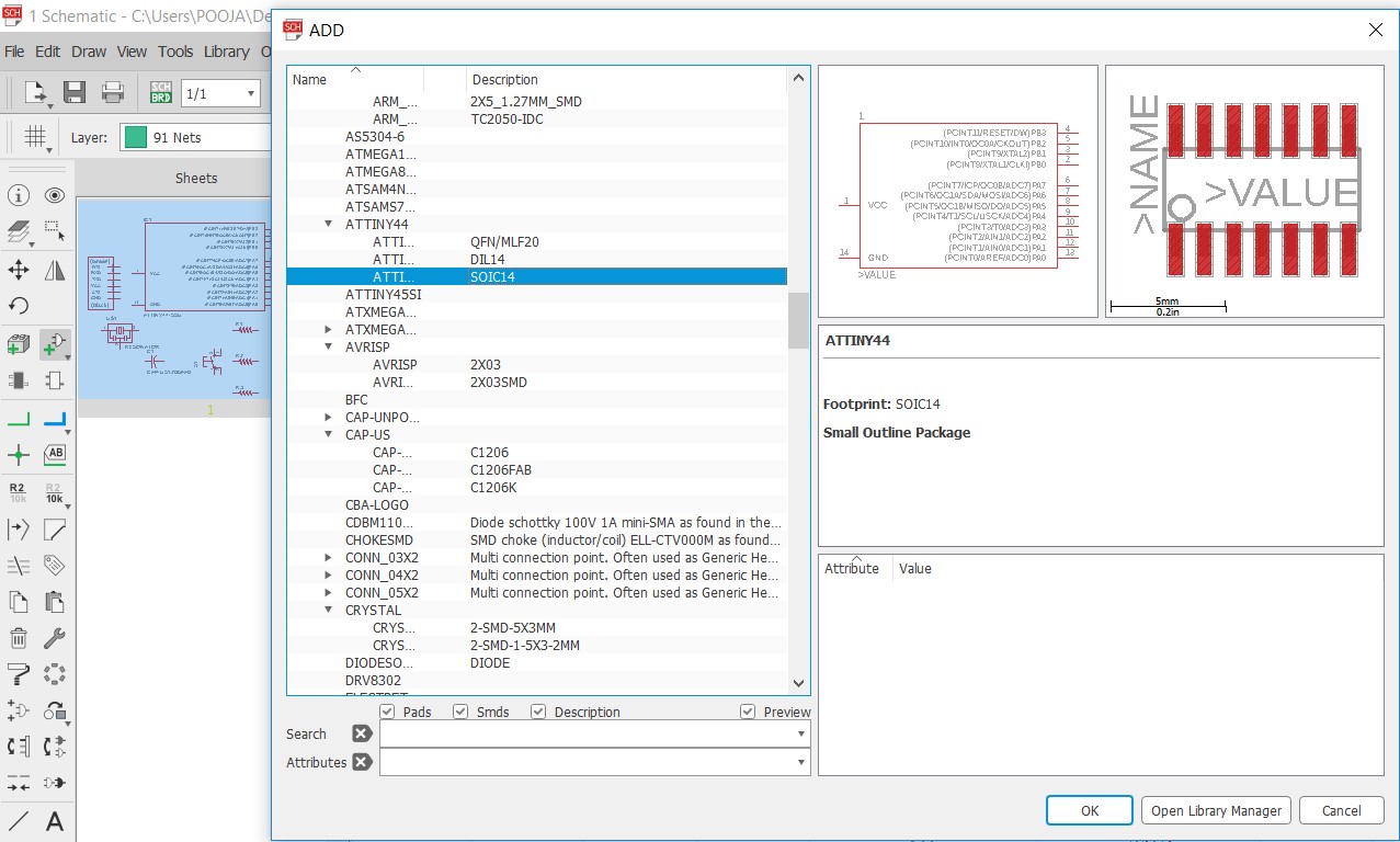 We started with schematic, here add all the components you want in the PCb, in my case I added,
