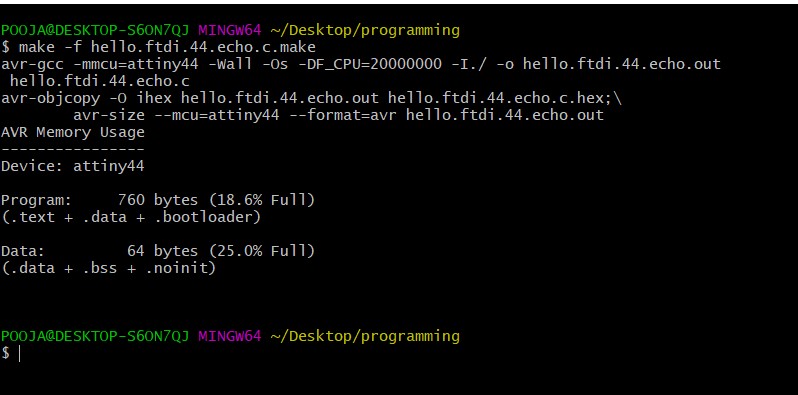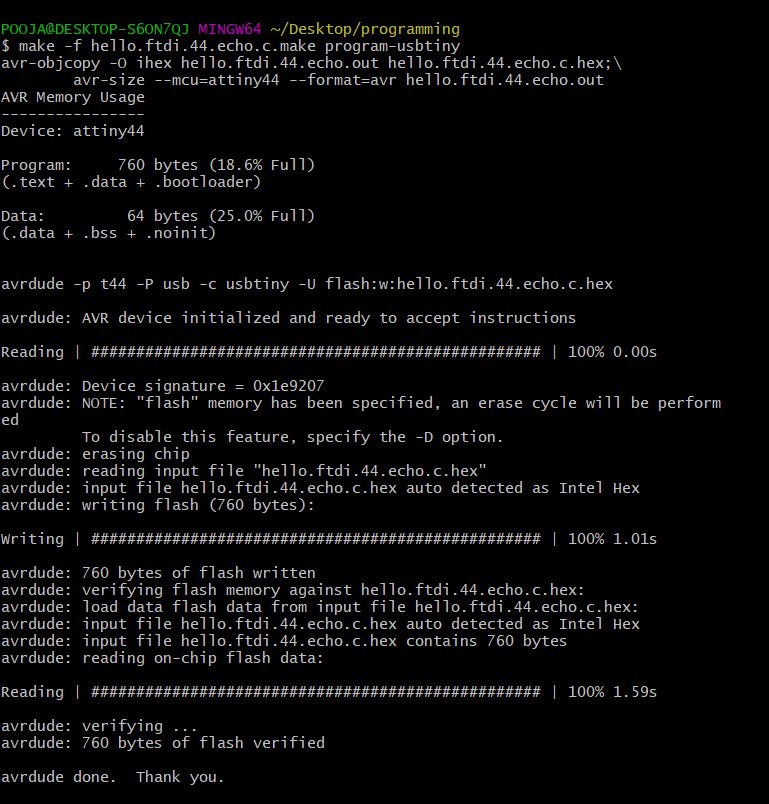 Here,I doing programming on my "Hello echo Board" first step is to make sure that the toolchain are installed i.e avrdude and avr-gcc. Then I downloaded the example code in C and make file and follow the