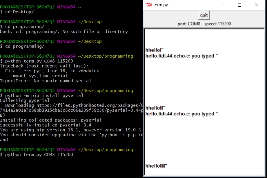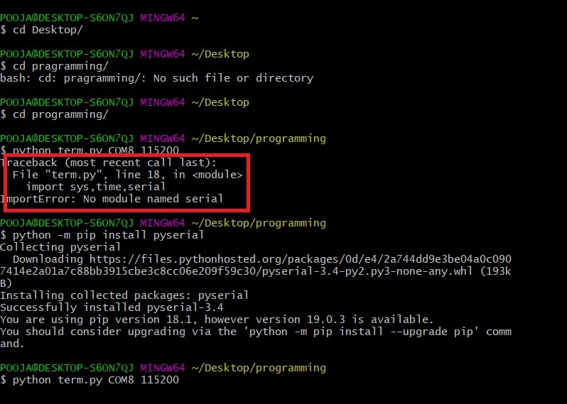 "Python term.py COM8 115200" this command come up with Error "No module named serial". Okay! I missed one step