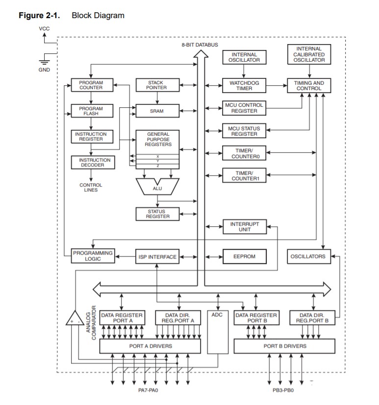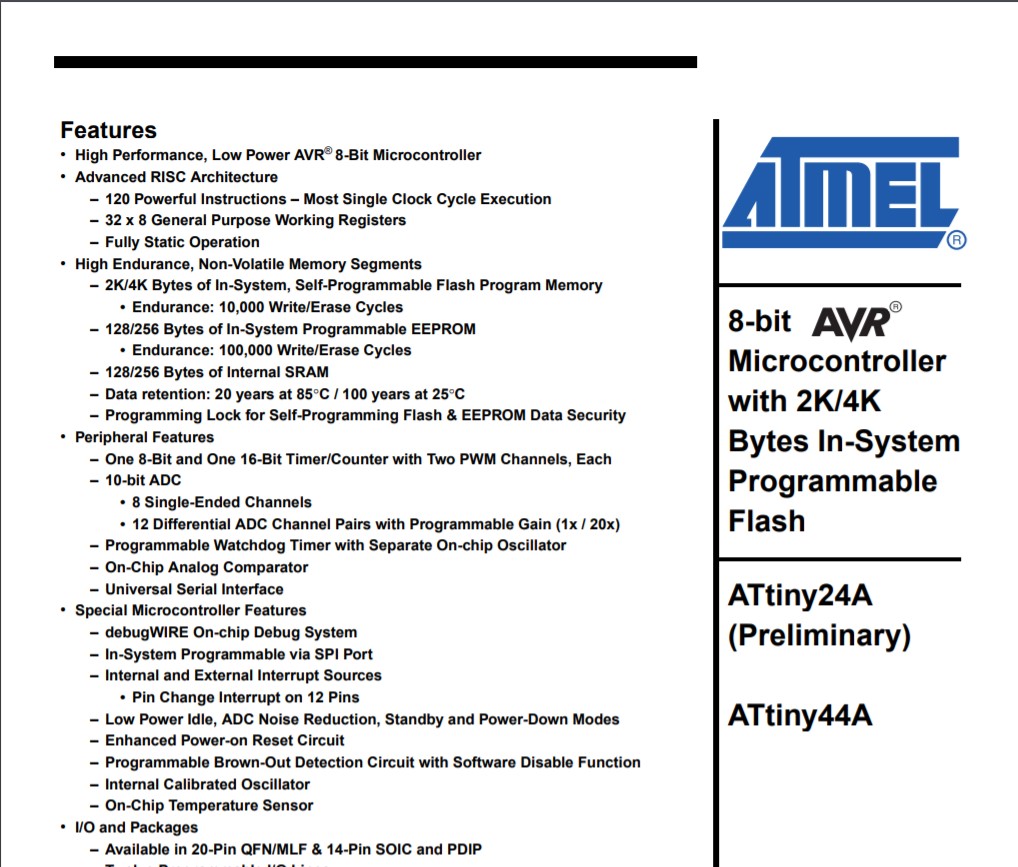 ATtiny44A are low-power CMOS 8-bit micro-controllers based on the AVR (controller family) enhanced RISC architecture.(reduce instruction set)