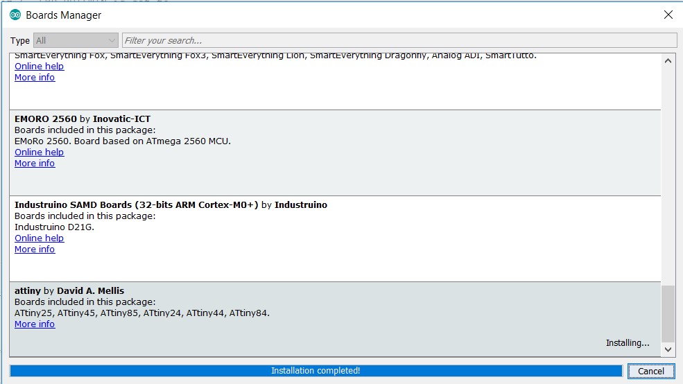 5.For adding Attiny Library.Open the boards manager in the “Tools -> Board” menu.at the bottom of Board manager I saw entry of the Attiny.Click the install button.