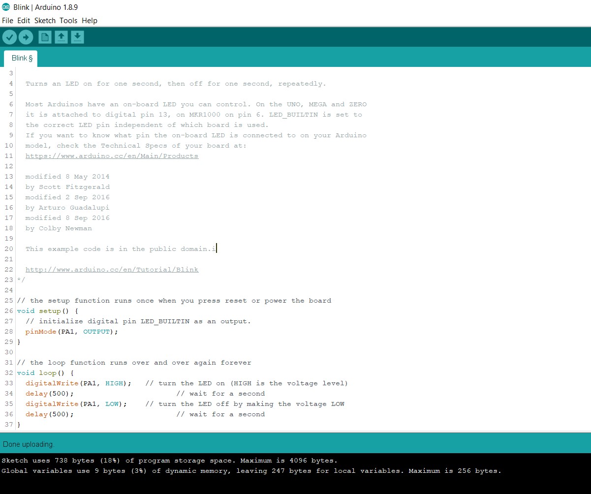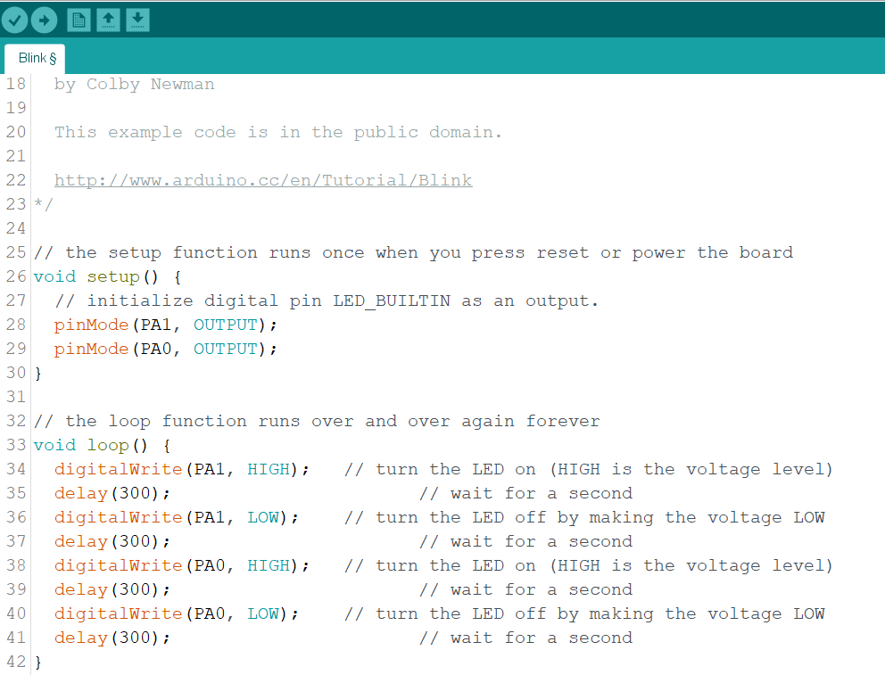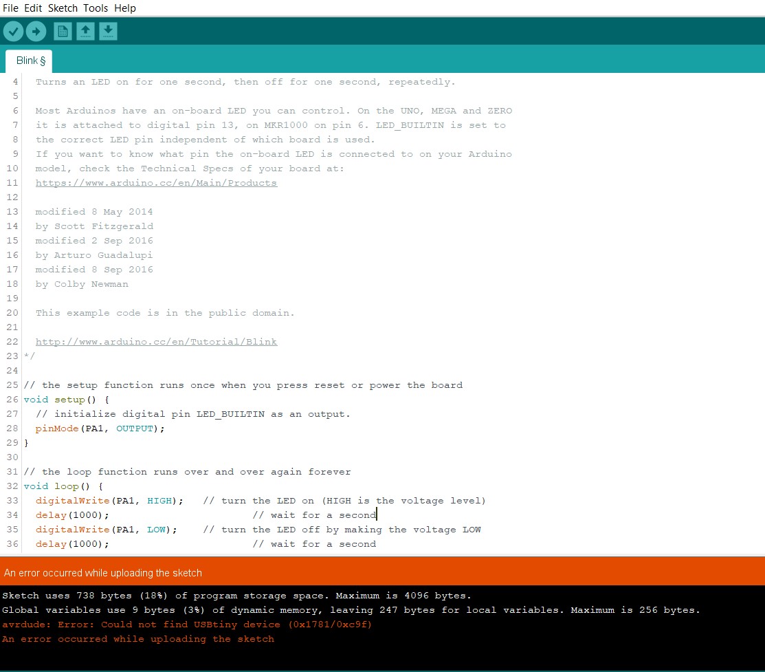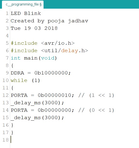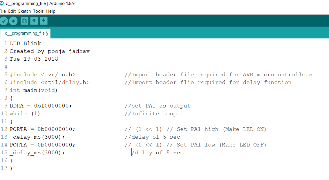 I used this program which are given in Arduino.I defined my IC Pin PA1 which is connected to LED.