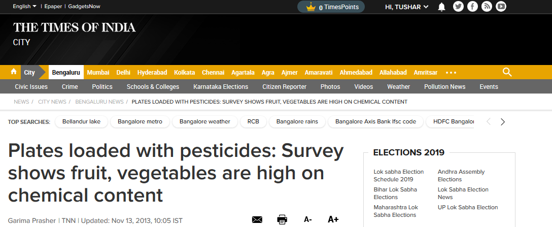 “An apple a day needn’t always keep the doctor away.”A study by the Food Safety and Standards Authority of India says, food items contain banned pesticides in quantities a thousand times more than the permissible limits.[5]