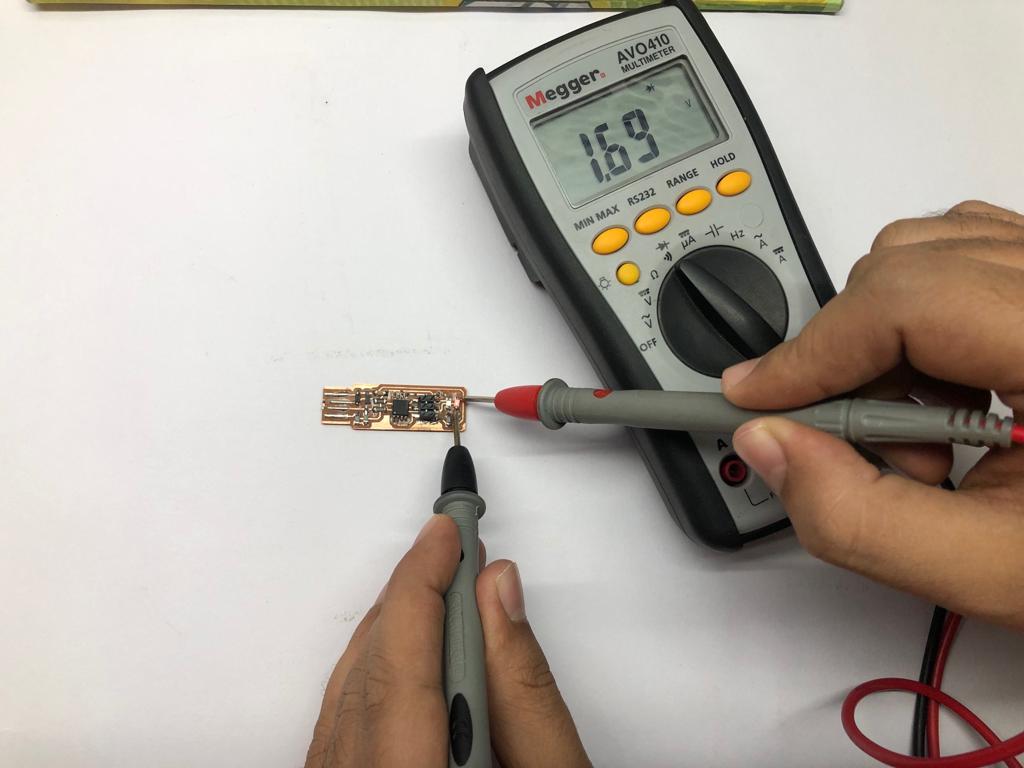I used multimeter to check the connectivty across all the parts. Using cathode and anode of multimeter to diodes,capacitor, LEDs,resisors,Integrated circuit(I.C) ends checked connections at major ends.