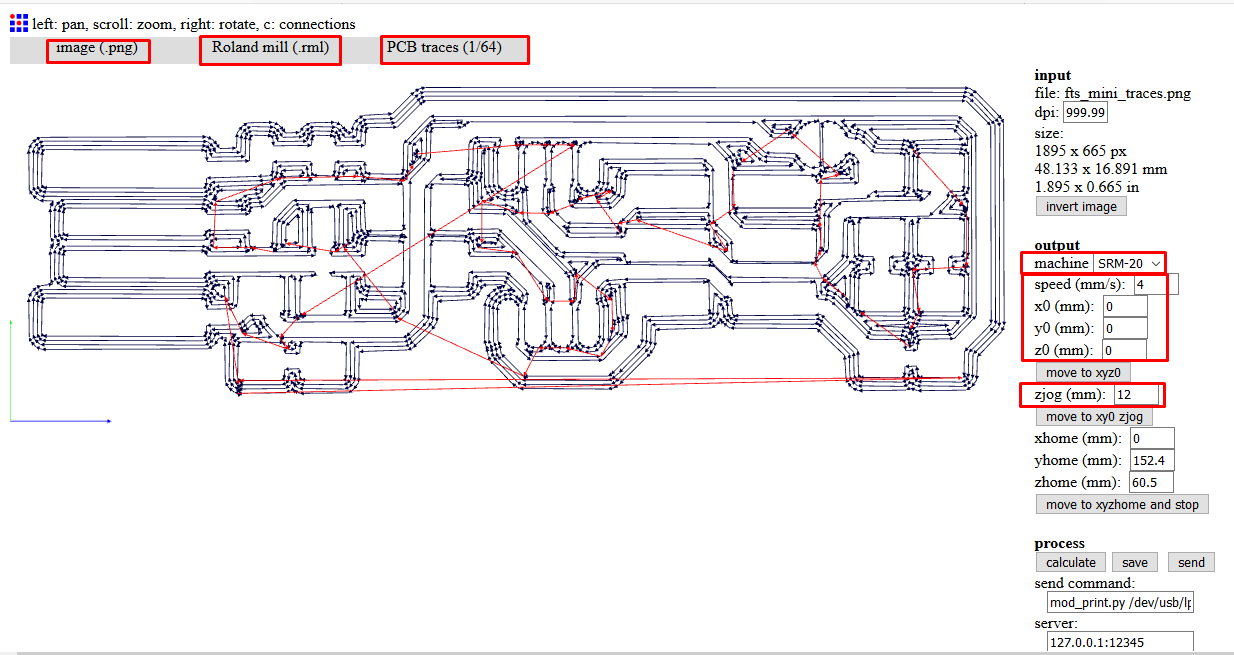 C.Process:for engraving/traces seleced “PCB traces 1/64” and for cutting “PCB outline 1/32”. Other processes which Fab modules support are rough and finish wax cut.