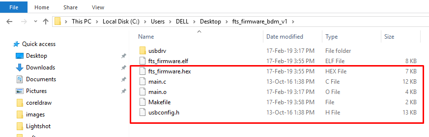 A.Filmware source code: Downloaded and extracted it.Used the command Run make in Git Bash. On completion a new file was added fts_firmware.hex.