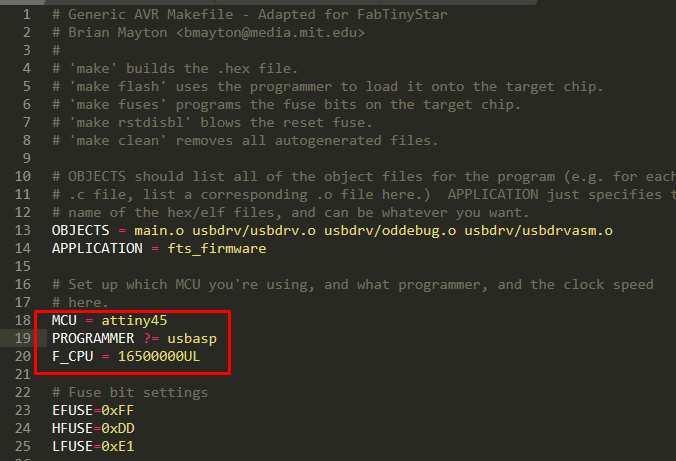B.Edited the MAKEFILE: I used Sublime Text to edit. The Makefile, by default, assumes that we will use a programmer in the usbtiny family which I edited to usbasp.