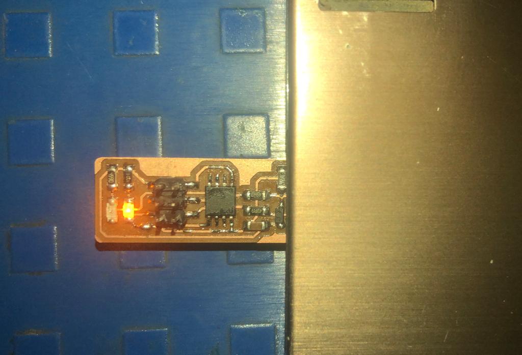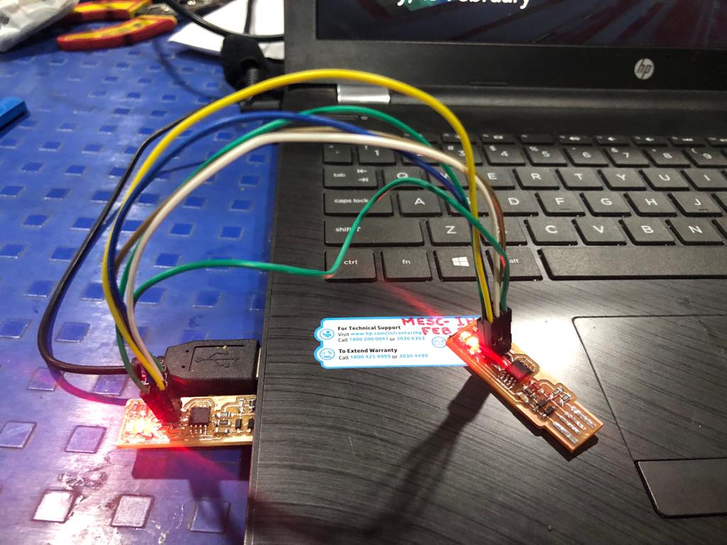 C.Pluuged the PCB board: Red LED lit on plugging the board in laptop port.The solder jumper was bridged which allowed LED to be the part of the connectivity.