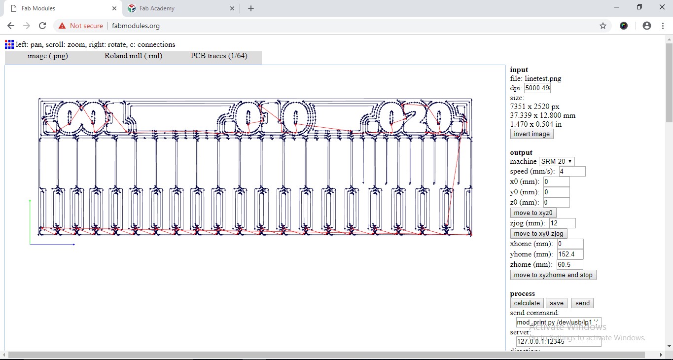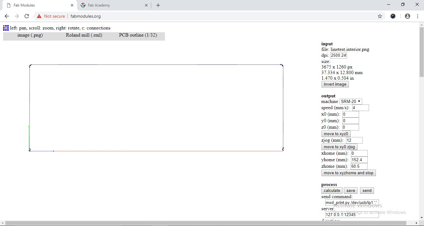 B. We used FabModules to generate .rml files. Various other settings like process,speed,X,Y,Z coordinates were entered.