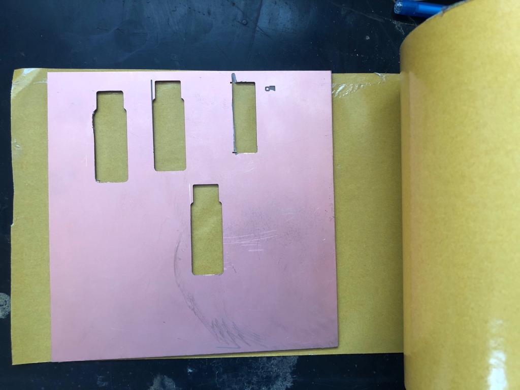 B.Sticked FR1 board to sacrifical layer: Double side tape sticked on the bottom of the FR1 board and I sticked it on the sacrifical layer.