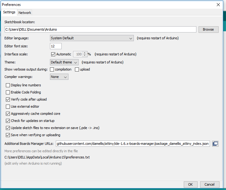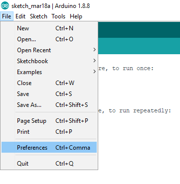 A. Prefernces: File>Prefernces.Opened the preferences dialog in the Arduino software.