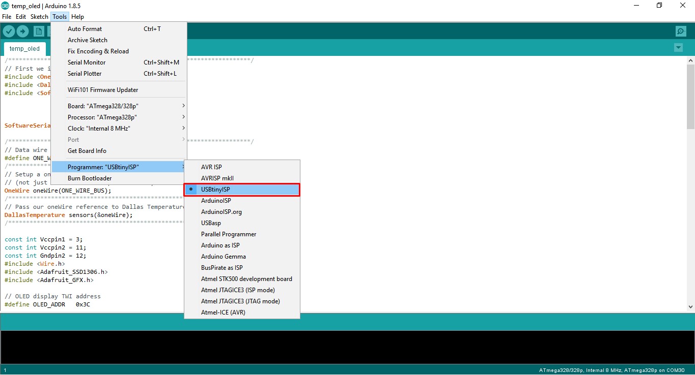 1. Programmer: I used my Fab ISP made in Electronics Production weekly project to programme the main board. Selected “USBtinyISP” as programmer.
