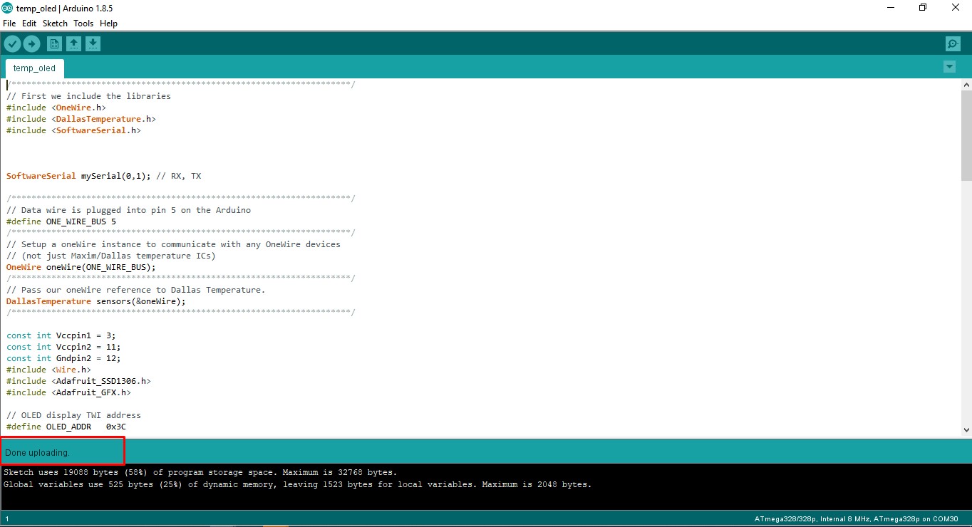 4. Further, OneWire.h, DallasTemperature.h, Wire.h,SoftwareSerial.h have been included for digital thermometer to read and send temperature.