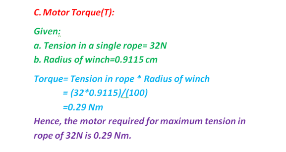 B.Calculations:Calculated the required torque of stepper motor on basis of tension in the rope and radius of the winch.