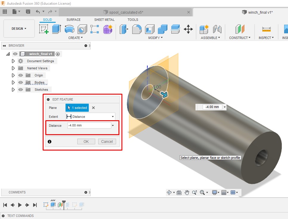 C.Construction Plane: Added a different plane 4 mm inside from the end. This marked the starting point of winch coil.