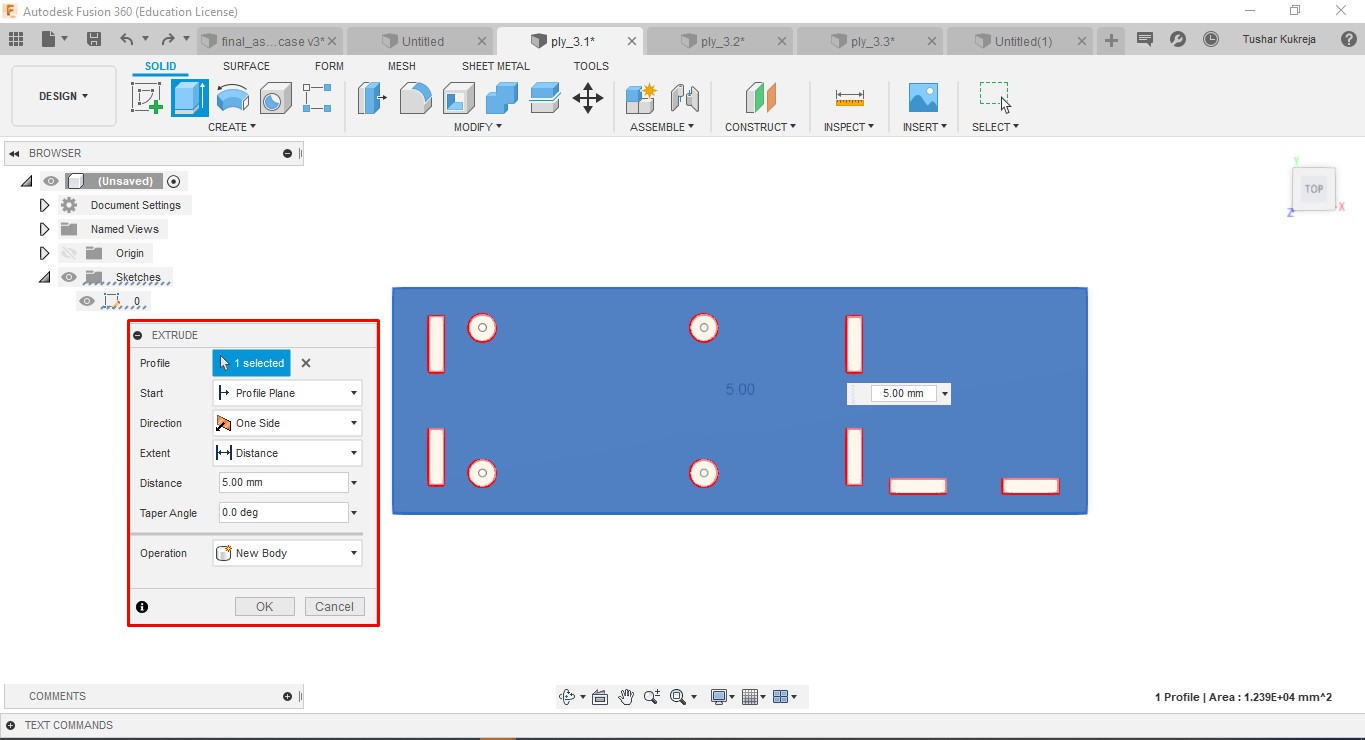 B. Extrude: Extruded the design 5mm since the case was to be built of 5mm plywood.