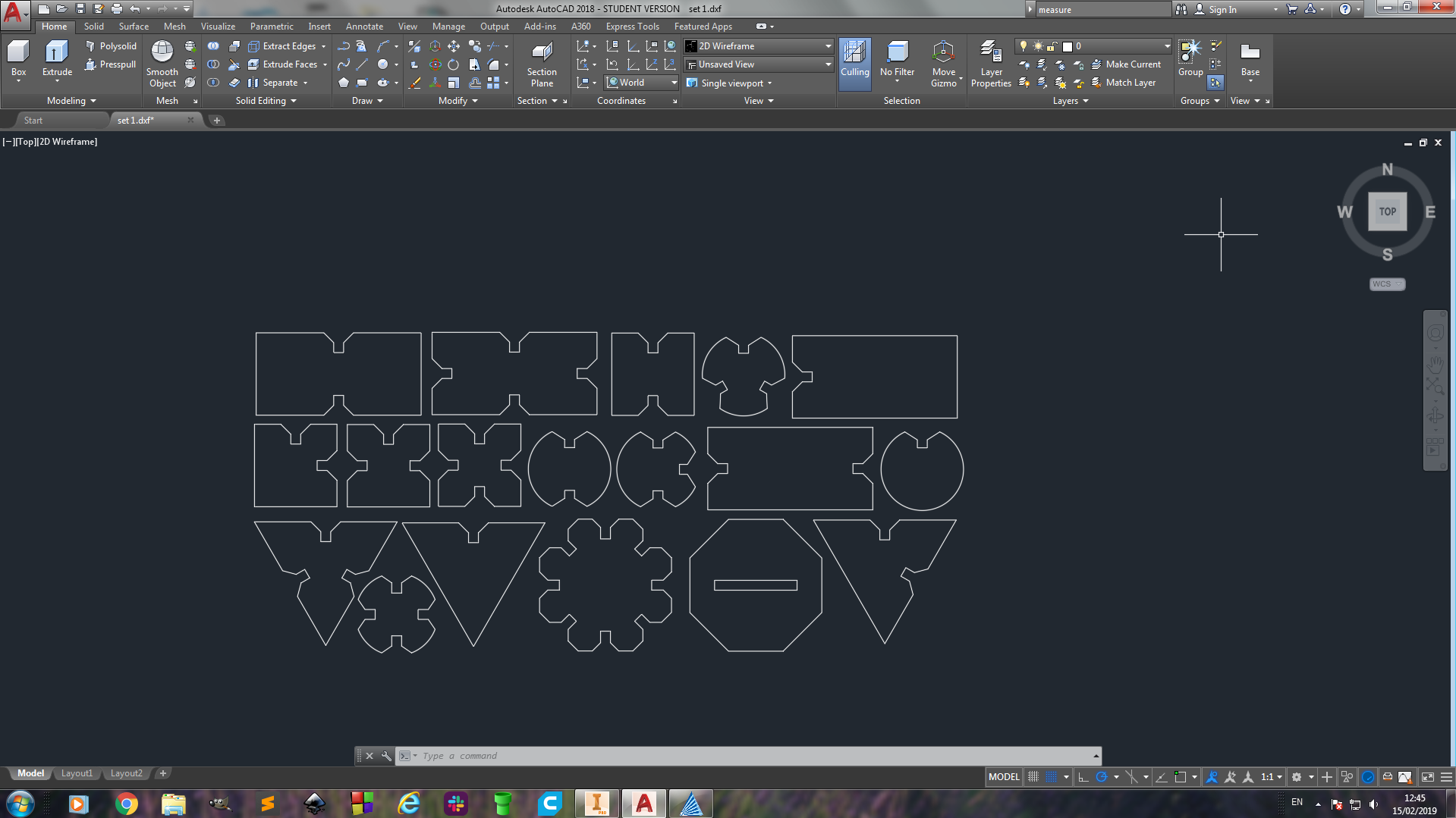 The files to be laser cut had to be organised to ensure optimum material usage as well as to ensure the laser head did not go out beyond the material datum. I thus did this on the Autodesk Inventor since I couldn't get many laser cutter softwares to work on Ubuntu LINUX, the set up was as shown below.