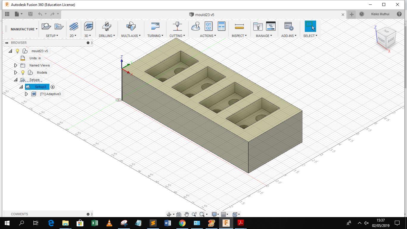 After ensuring all the parameters are set then the machining process can start. It is also importnat to set the origin of the machine to be as similar as that provided in the SRP player. Below is the final result of the machining process.