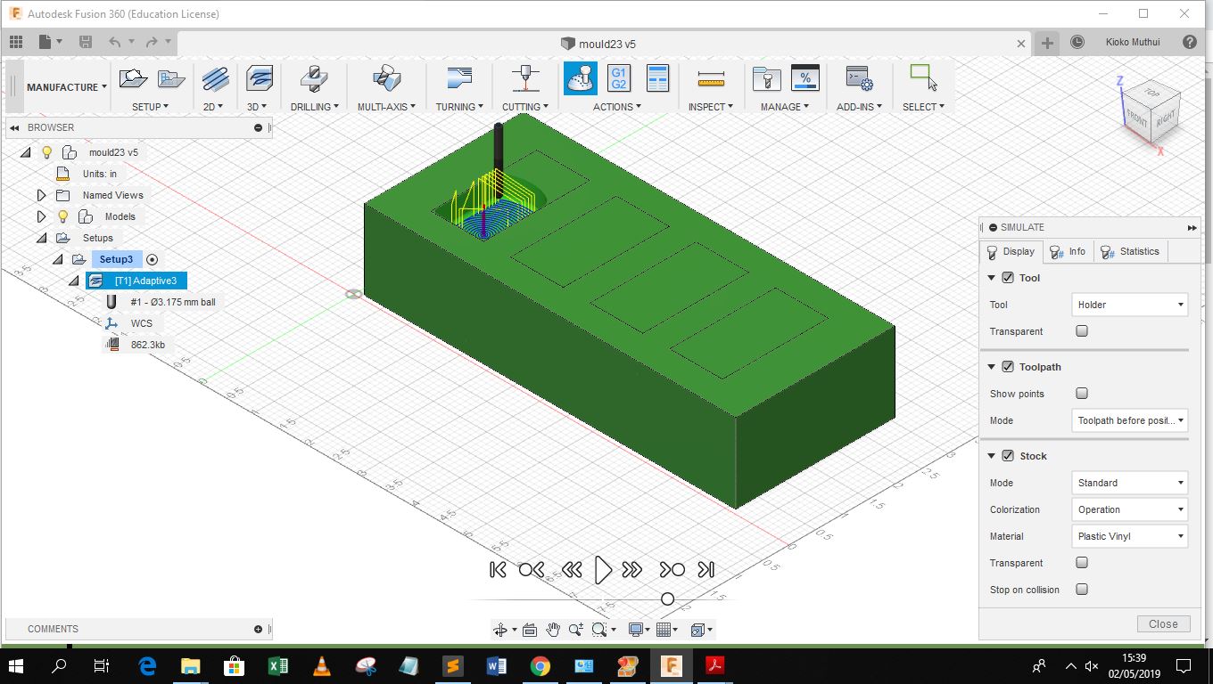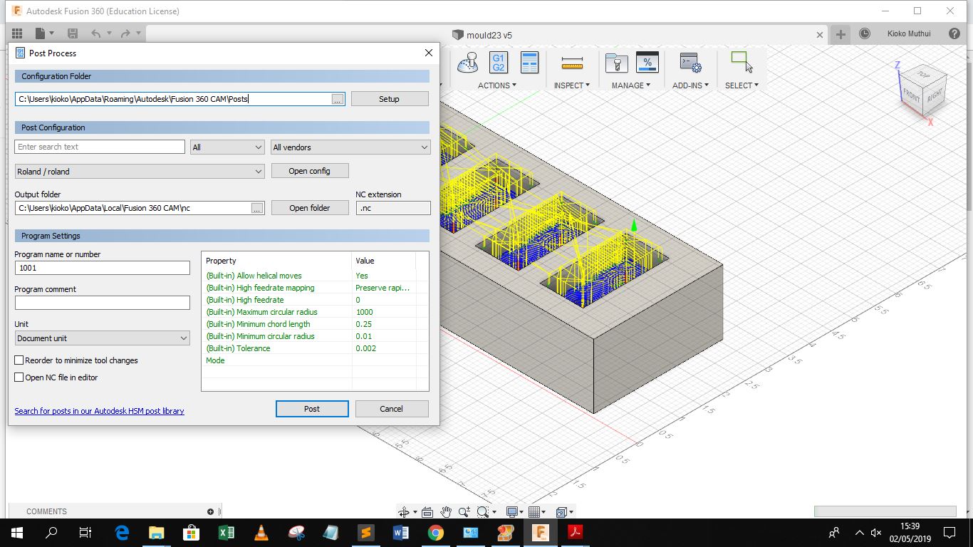 The next step involved post processing for the desired output machine which is the Roland Monofab SRM-20, The post processor of the machine however did not realize accurate machining as observed from a dry run using the Monofab SRM-20, The scale of the block was exagerated, in additon the origin setting was interprated inacurately. After further research online I decided to use the SRP Player.