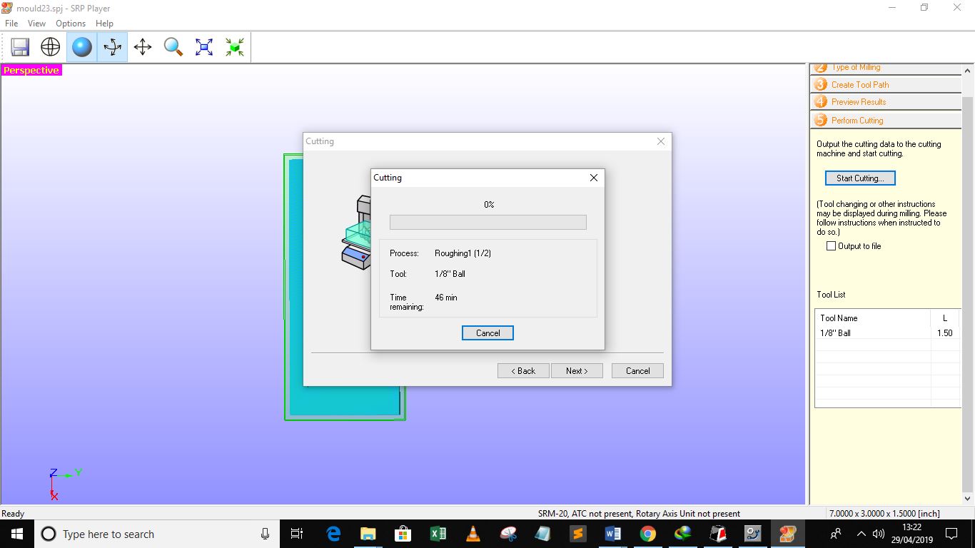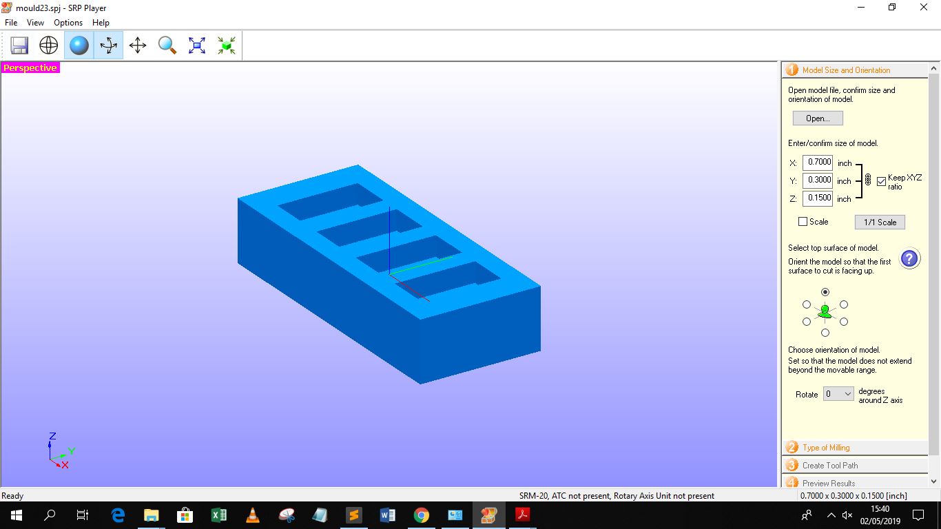 The SRP Player had a very easy to use interface as it only required me to choose the tool only, and define the block dimensions. The first step was however to export the object in an stl format from the CAD software used in my case was both Autodesk Inventor and Autodesk Fusion
