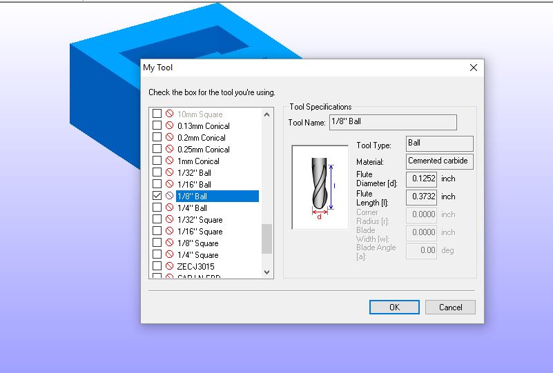 The next step involved using the Cam Processor for Autodesk Fusion to manufacture the part. This begun by creating the tool available at our Lab for use which is the 1/8" ball point mill.