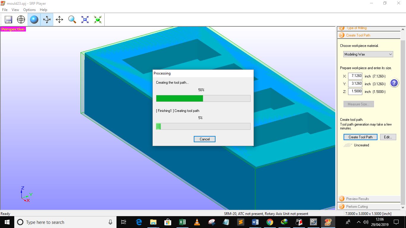 After selecting the tool, and indicating the milling parameter, the next stage is creating the tool path. The SRP generates the NC codes based on the parameters provided, the application also provides the user with options of customizing the tool path and operations to be done.