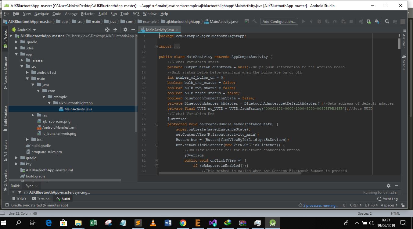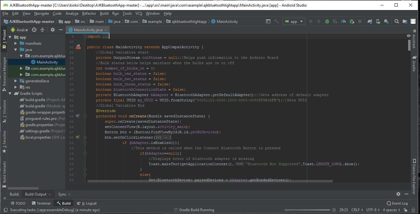 The first step is to write the Java COde for the application, however when doing this it is important to have developed the embeded system program before hand so that one cannow the instruction set sent from an input device and how it is interprated by the app. There are three vital stages for my project, one is to ensure the smartphone connects to my projetcs blue tooth module, the other is to ensure there is transmission and receiving of instructions through the wireless connection. while the last bit is to ensure the instructions are interpreted correctly and achieve the expected outcome or result of the desired operation.
