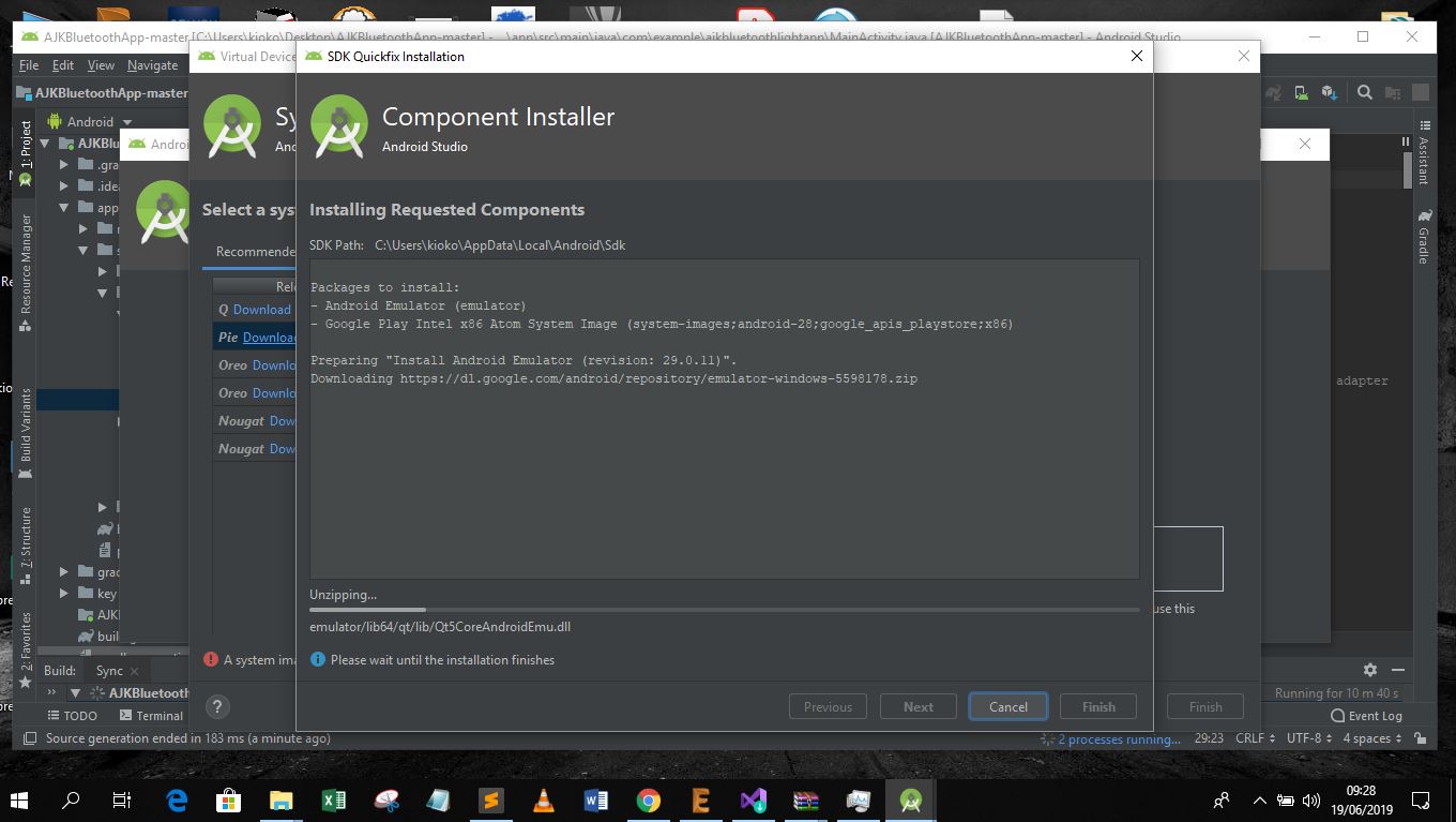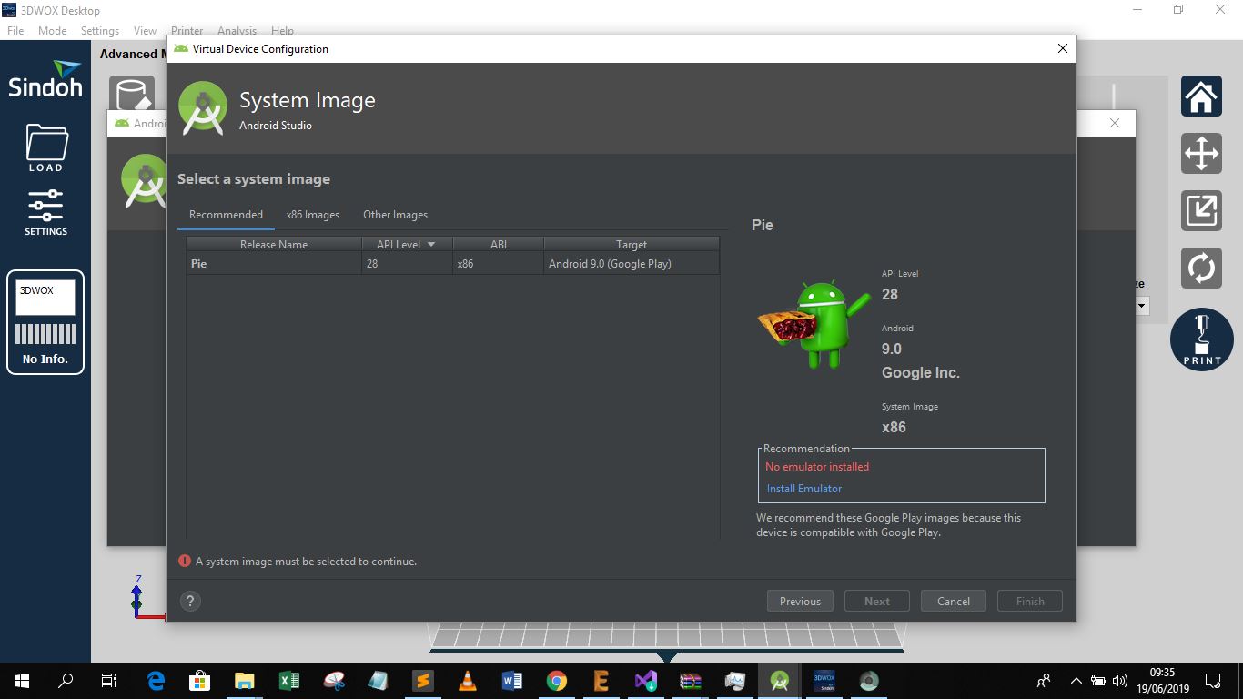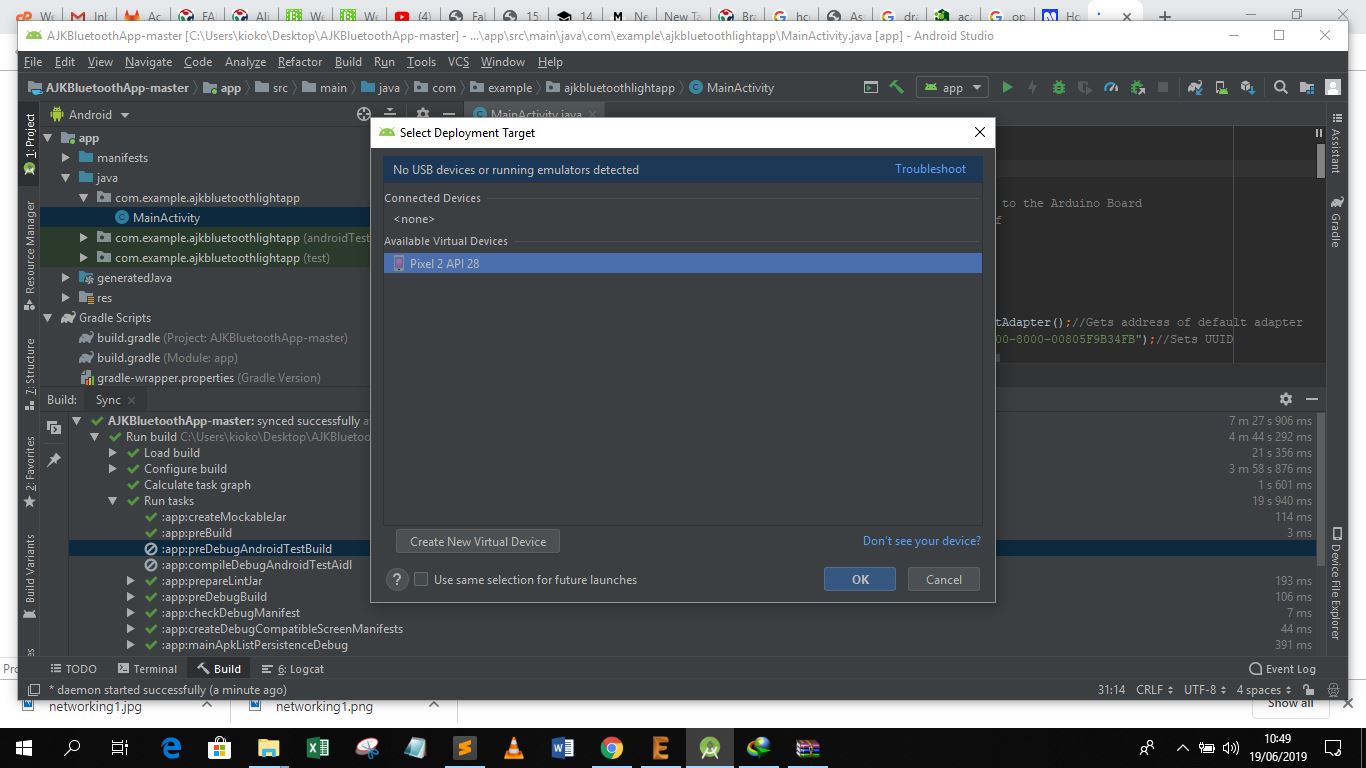 After linking up the instruction sets through the code based on the functions.The next step is to implement the graphical user interface on the smartphone. To do this one needs to install or enable a virtual device emulator. There are two options to this one is creating a virtual device on your computer or enabling the developer options of a smartphone and connetcing it to the program. The latter is better as it does not overwelm the grapghic processor and memory of the computer. Below are the stages used to activate this linkin from the computer.