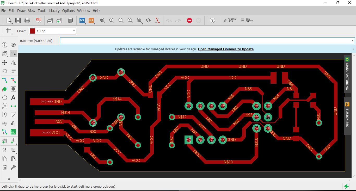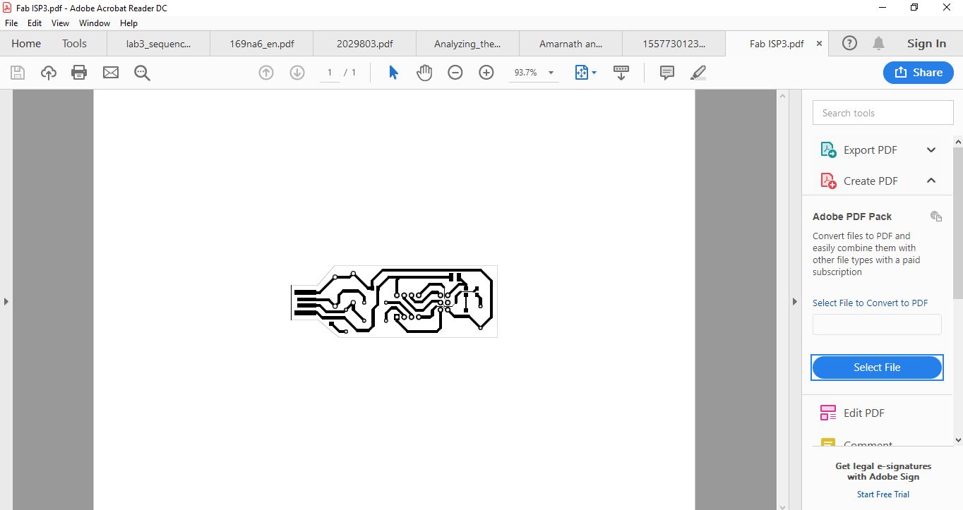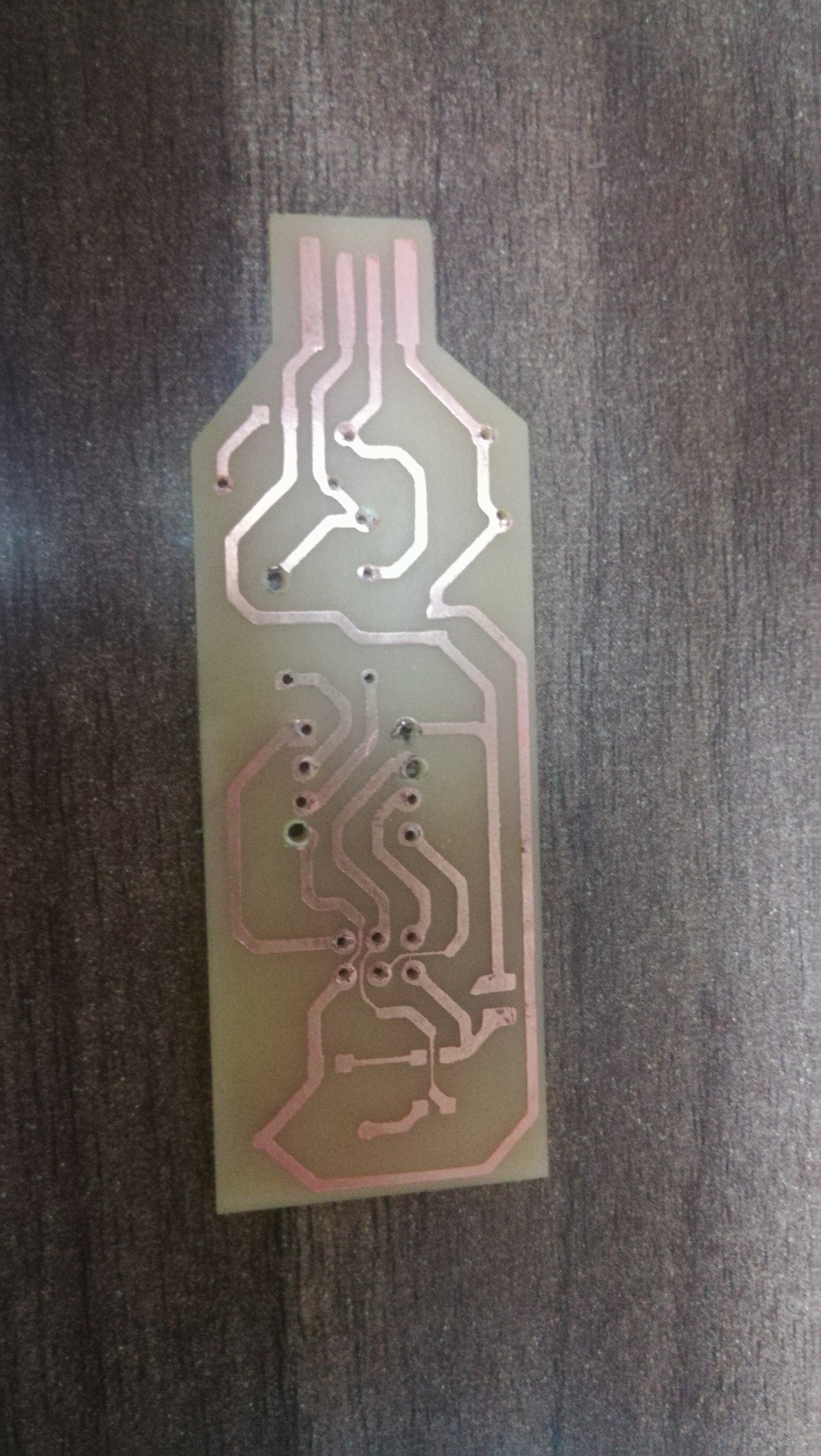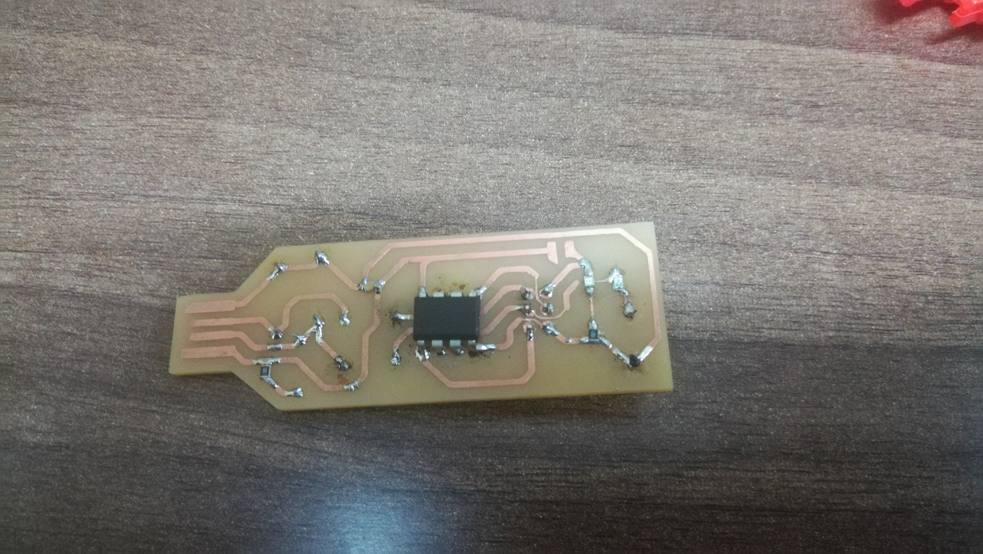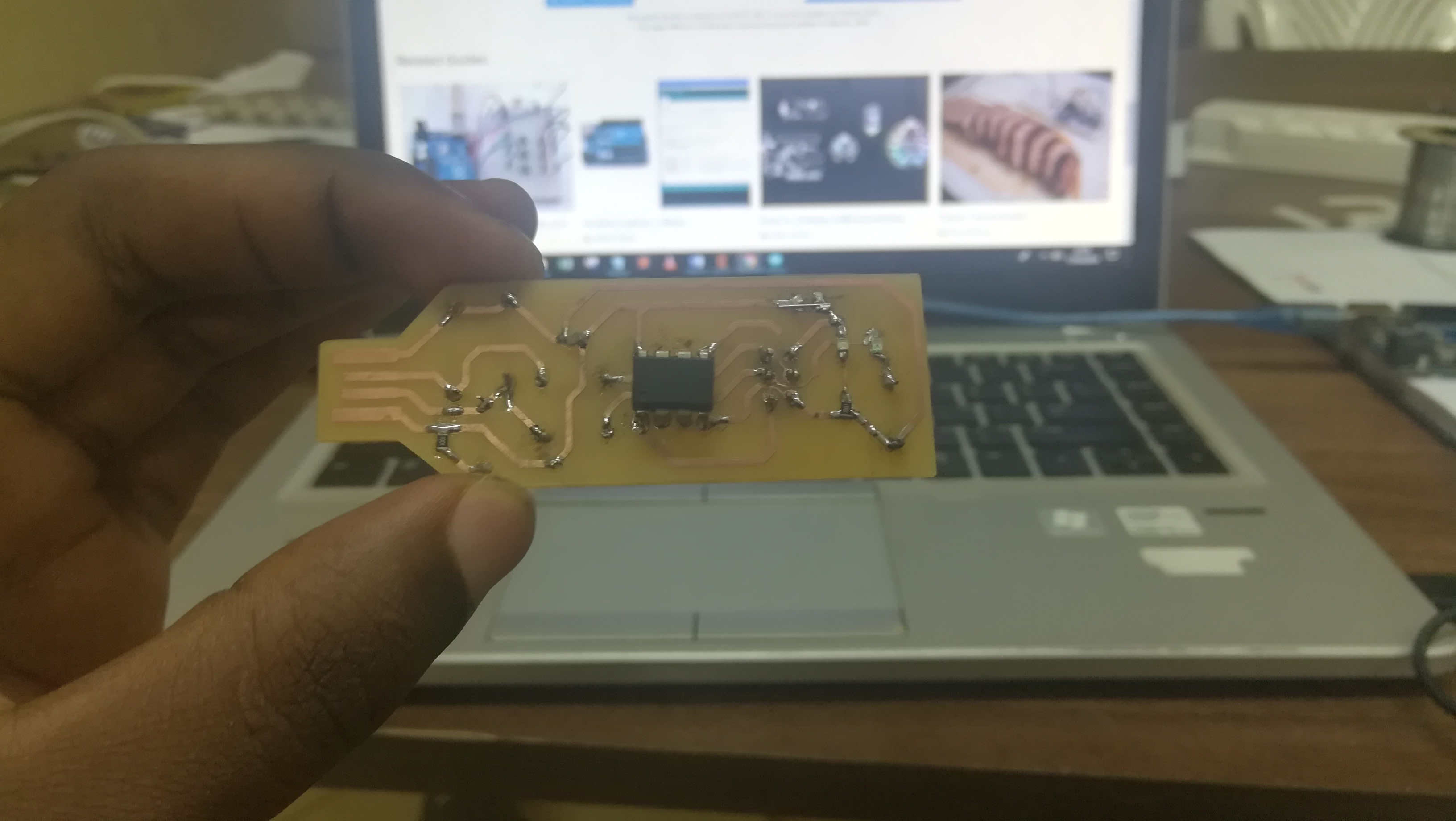 Machine set up is also important. I used double sided tape to place the board and folowed the procedure to set the origin of the z axis. I then uploaded the generated file from fab modules to the vpanel and generated the output. For the board it was important to reduce the speed of the machine and the spindle slightly because the endmill used is delicat. It is also important to monitor the machine as it cuts so as to avoid errors in real time. Also do not change the origin between different operations. The final board is as shown below:
