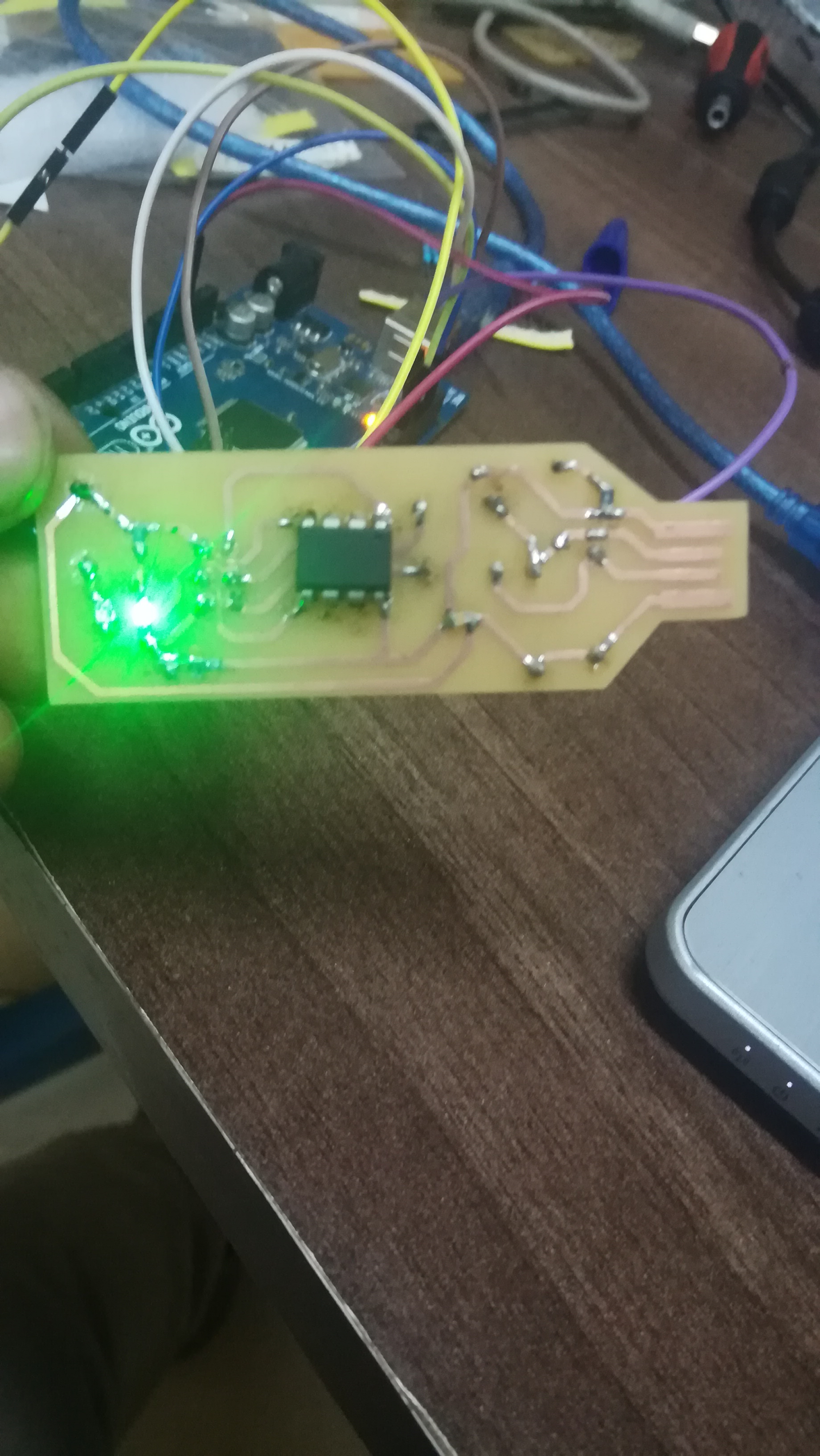 The next stage was to program the board. In this case I used an arduino as my programmer. I uploaded the ArduinoISP program to the arduino mega, and disconnected it from the computer. I then connected my board to the arduino using the provided programming pins. Then connected the arduino back to the computer and set the bootloader to be Arduino as ISP. Selected the board to be Attiny85 and uploaded the blnksketch program