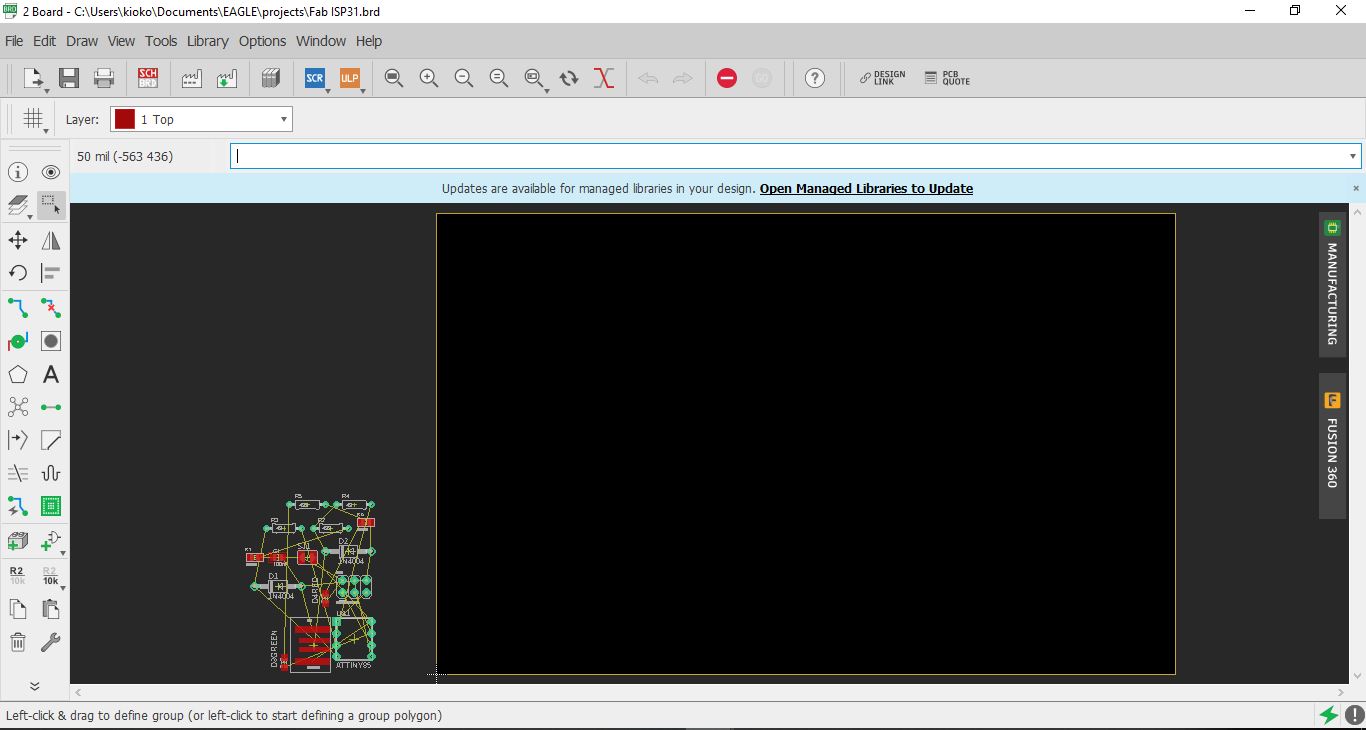 The next stage was to design the board, I exported the circuit to the board design and begun arranging the parts as I would like them to appear on the board.