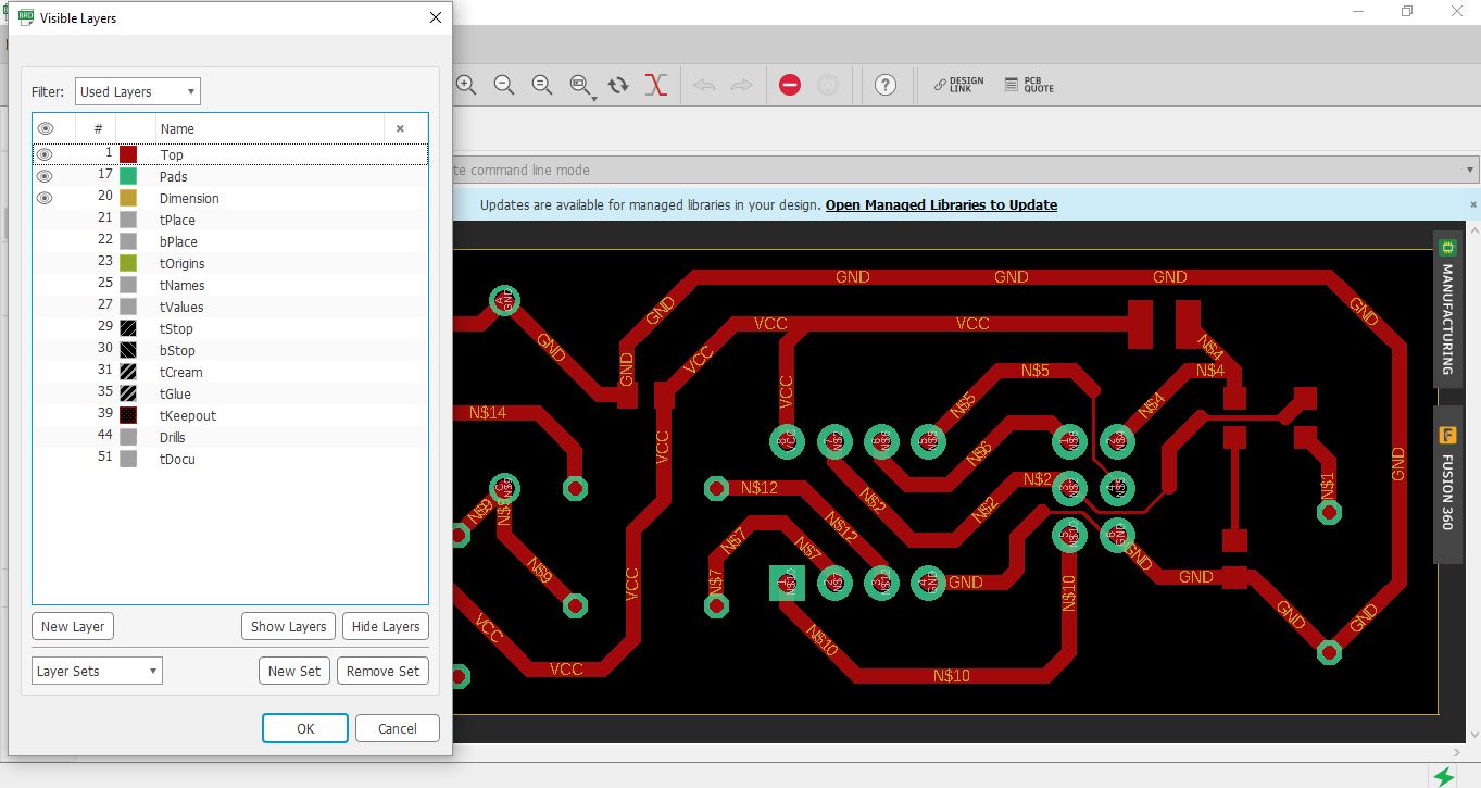 In order to export for machining of the different elements of the board, some layers have to be switched off, for example the process orders involve creating the tracts first, then drilling holes and later cutting out the board