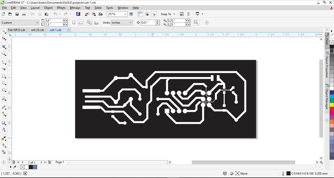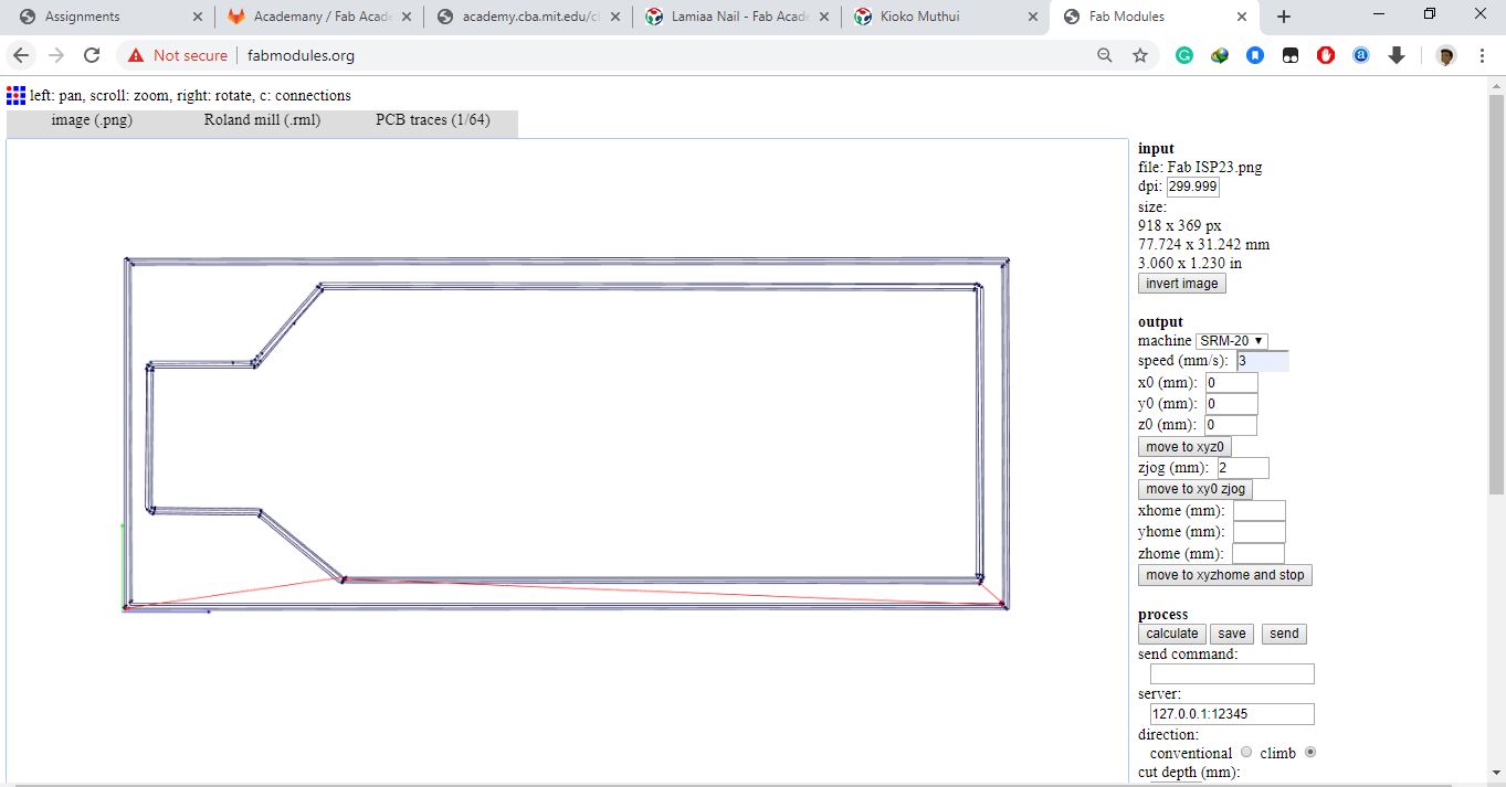 The next step requires one to go FabModules, At fabmodules one selects the file format in this case png then uploads the file and proceeds to setting the parameters for the operation. The parameters include selecting the machine or file format in this case Roland mill. A right tab will then appear where the user specifies the origin of the machine. The speed for the operation and z-jog which is the displacesment of the z axis as it moves across the board. The traces path is shown below using the 1/64" end mill