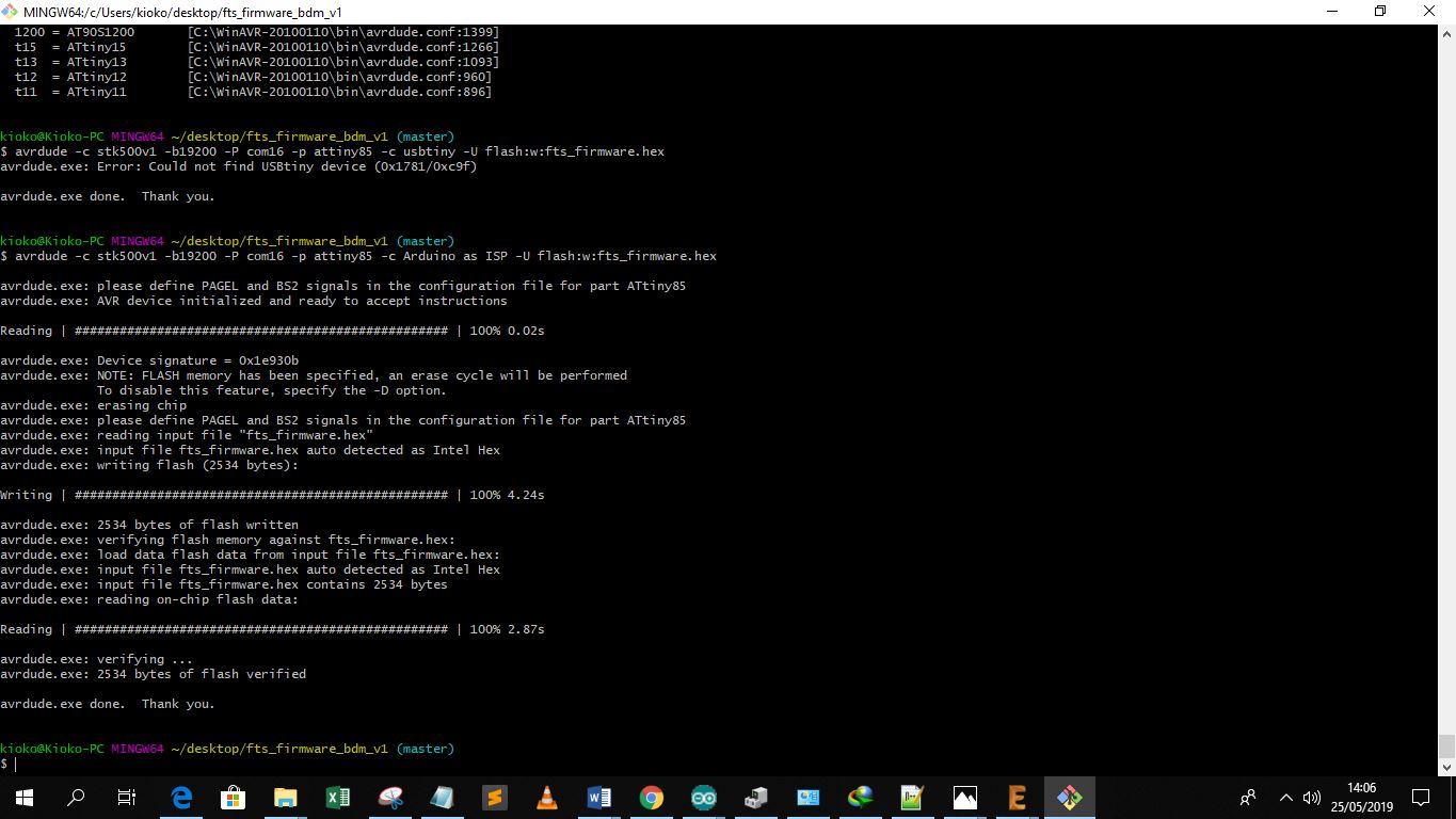 The next step was loading the firmware code to the fabISP, this was quite difficult on the go as I am using windows and i was using arduino for a programmer. The firsts tep involved downloading the firmware from here afterwards unzip the files and save them on your computer Before proceeding ensure you have followed the steps stipulated here After installations are done start git bash and perform the necessary prechecks to check if avrdude and GNU MAKE are set up correctly. Since i am using arduino as my programmer I utilized the data sheet provided to connect the pins as required for this i utilized the data sheet as provided