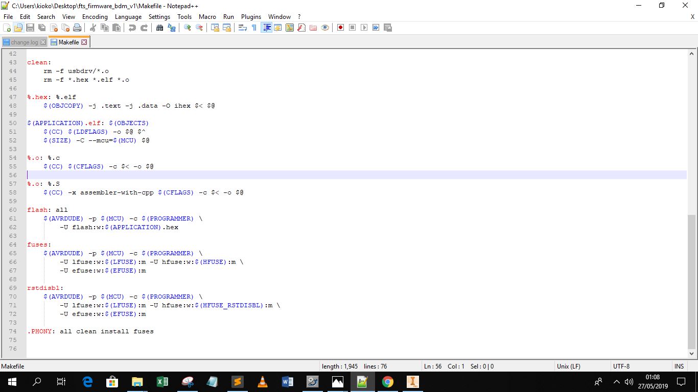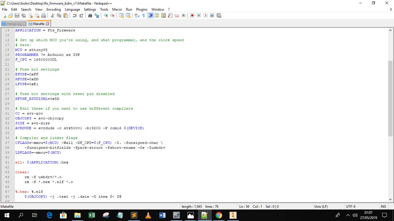 The next process involved altering the make file in the unzipped firmware folder, from the tutorial it was necessary to do that using the notepad++ editor. Since i am using the arduino as a programmer and attiny 85 I edited it as shown below